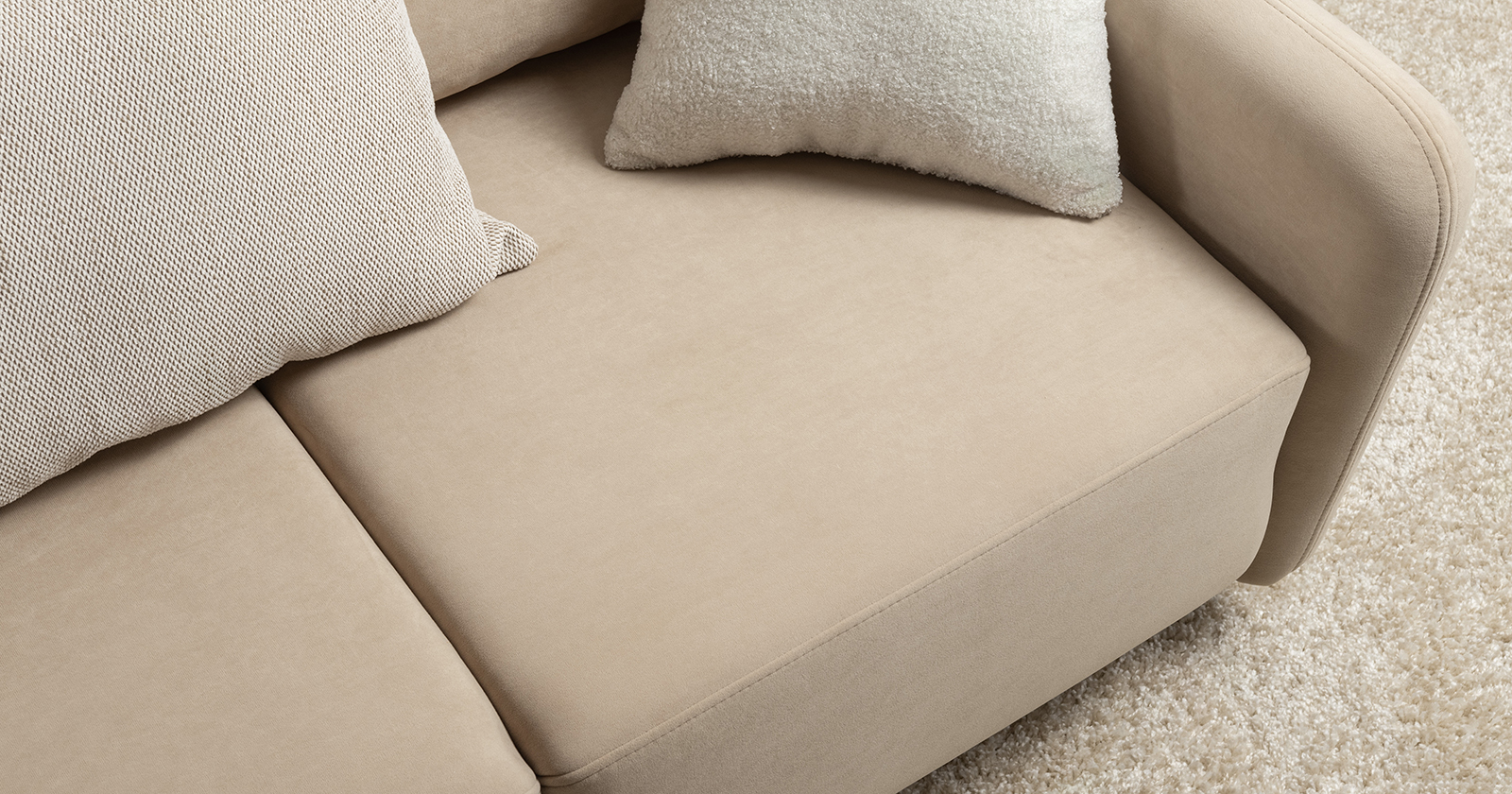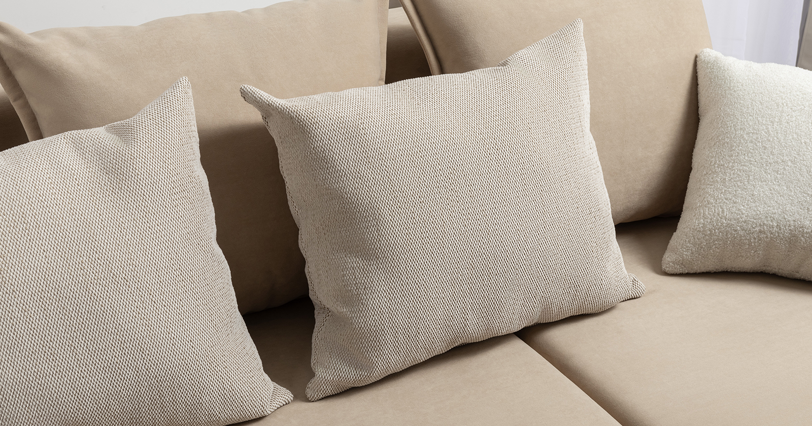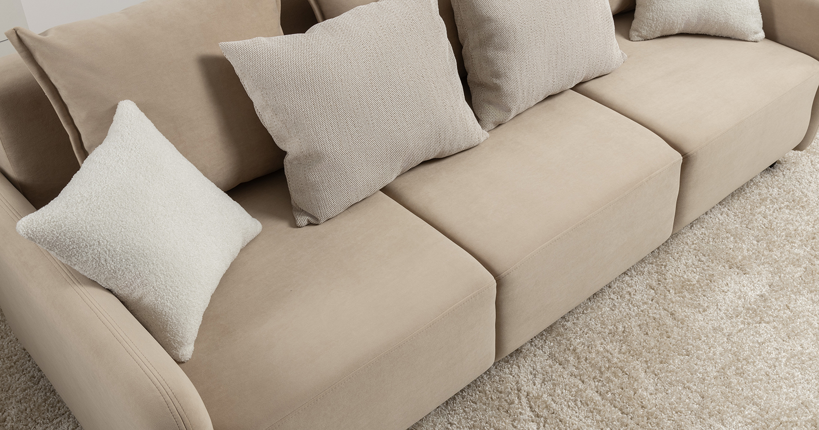 В комплекте 5 двусторонних приспинных подушки и 2 декоративные думки. Задняя спинка в ткани основы. Декоративные отделочные строчки по боковинам и сиденью