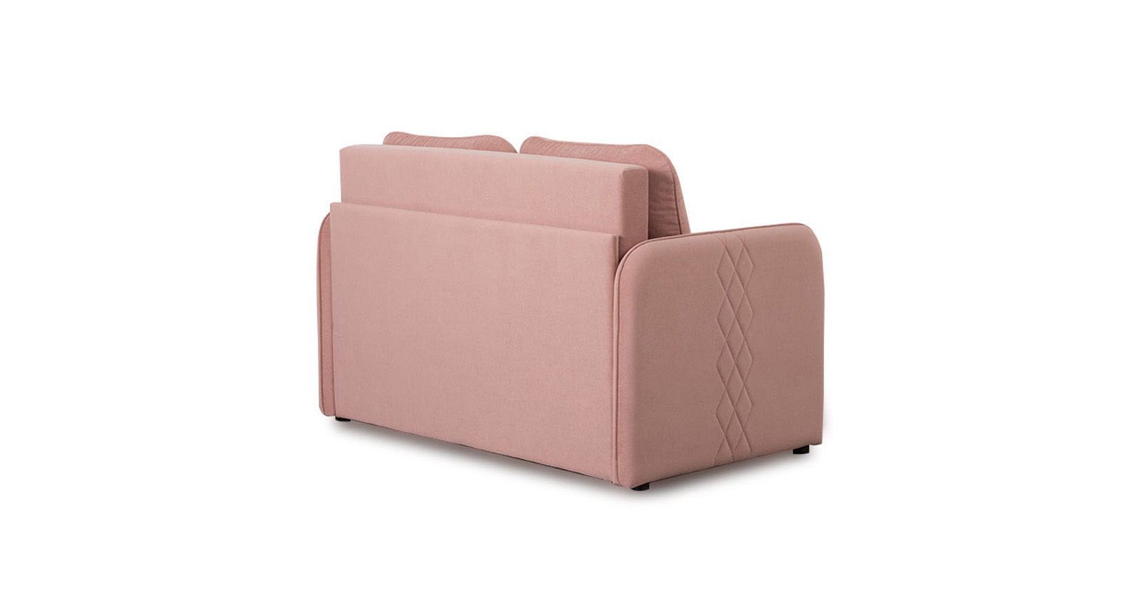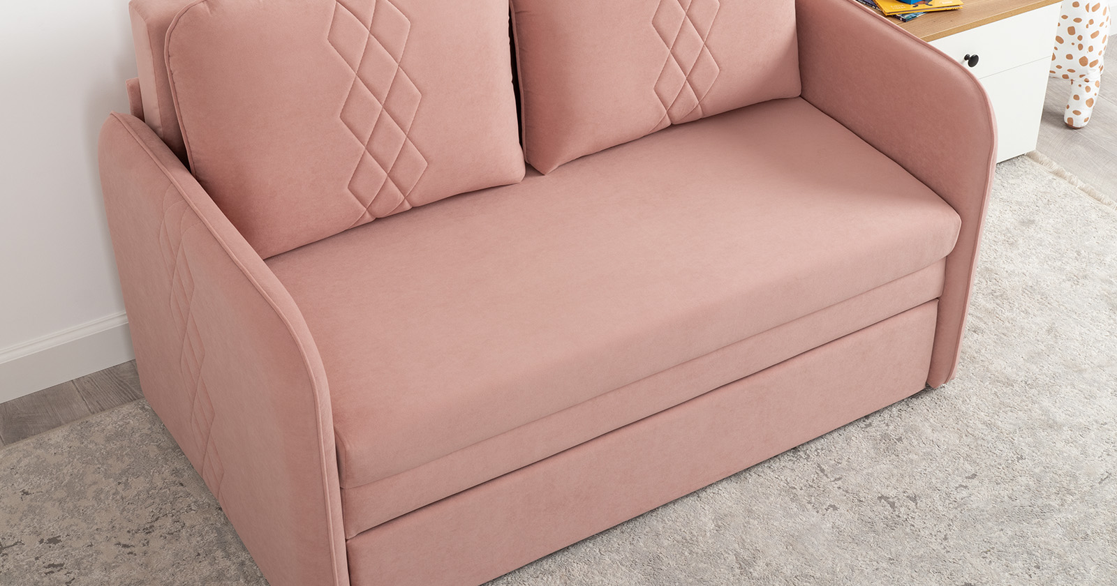 Стильный компактный диван для детской и гостиной. При своих скромных размерах он трансформируется в полноценное спальное место для детей и подростков. Лаконичный дизайн в виде декоративной стежки подчеркивает фактуру велюра, а небольшие размеры позволят разместить его в любом пространстве.