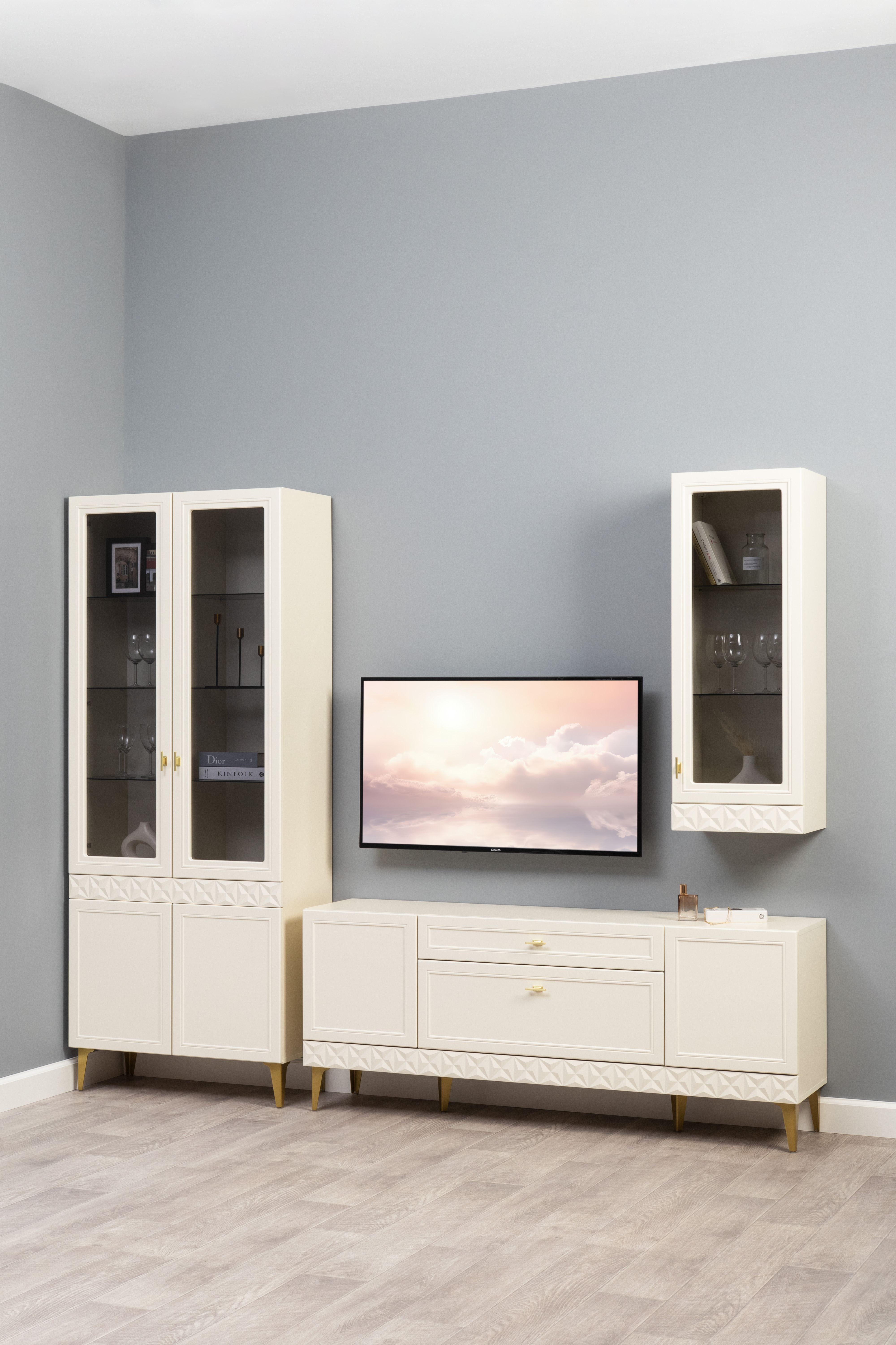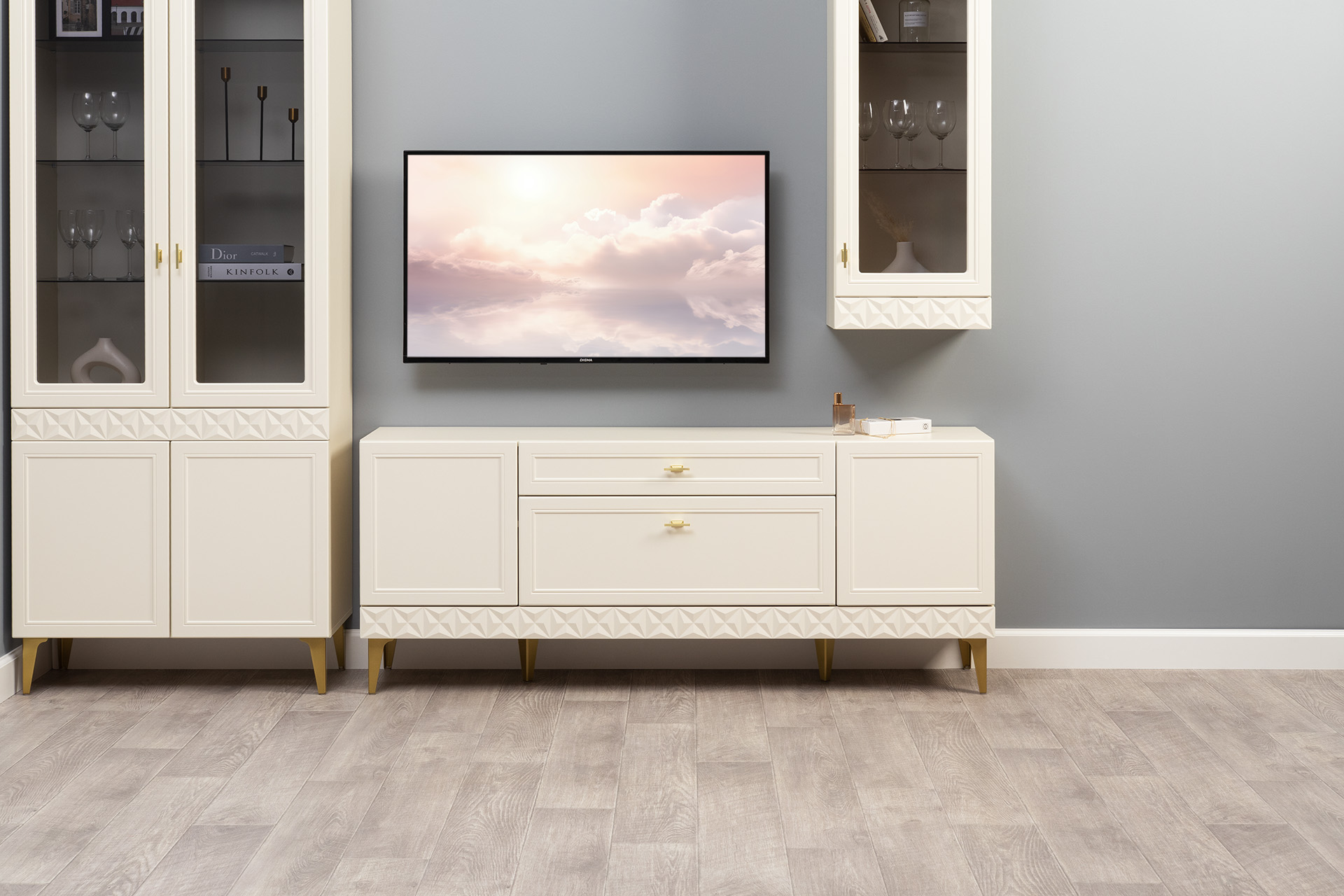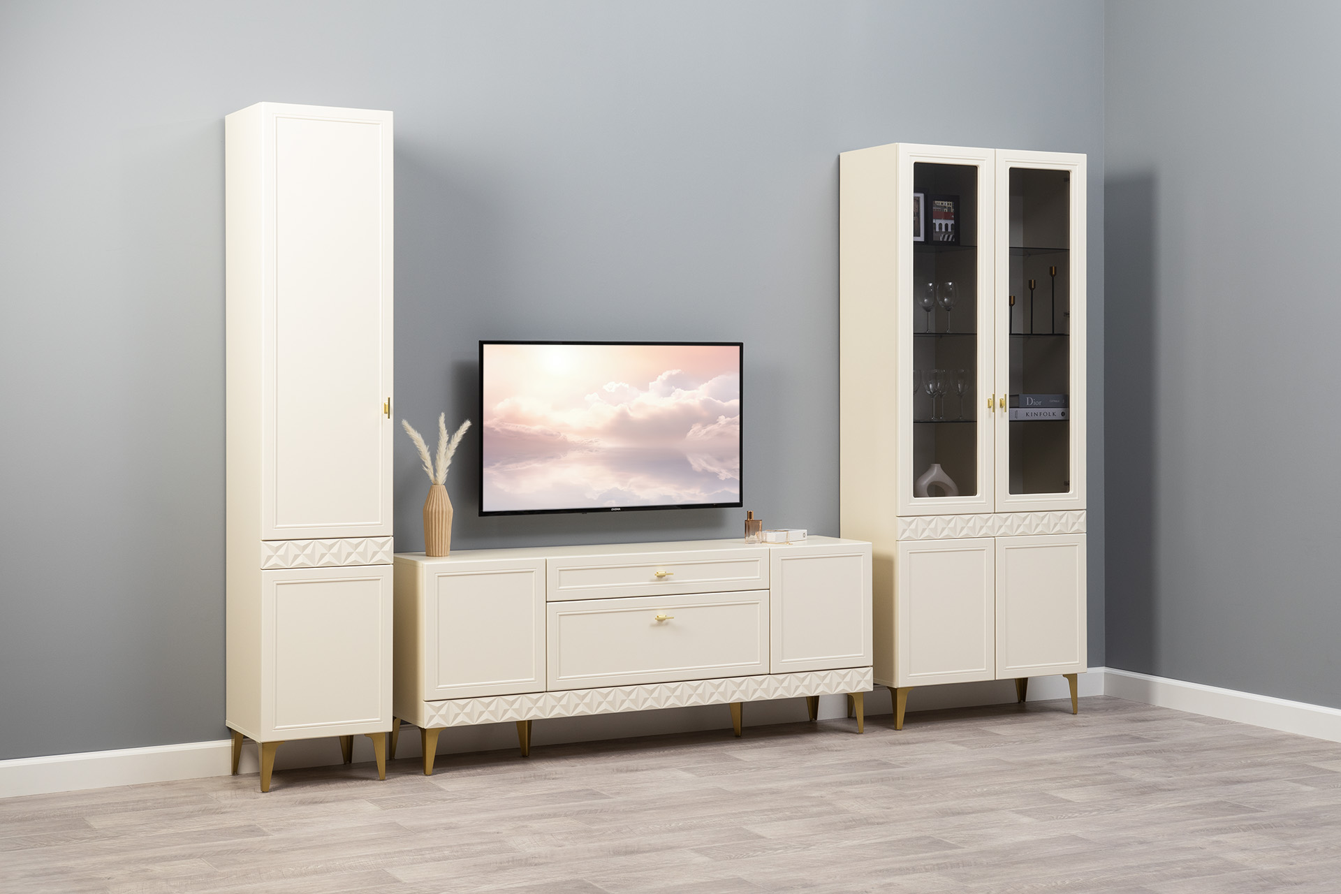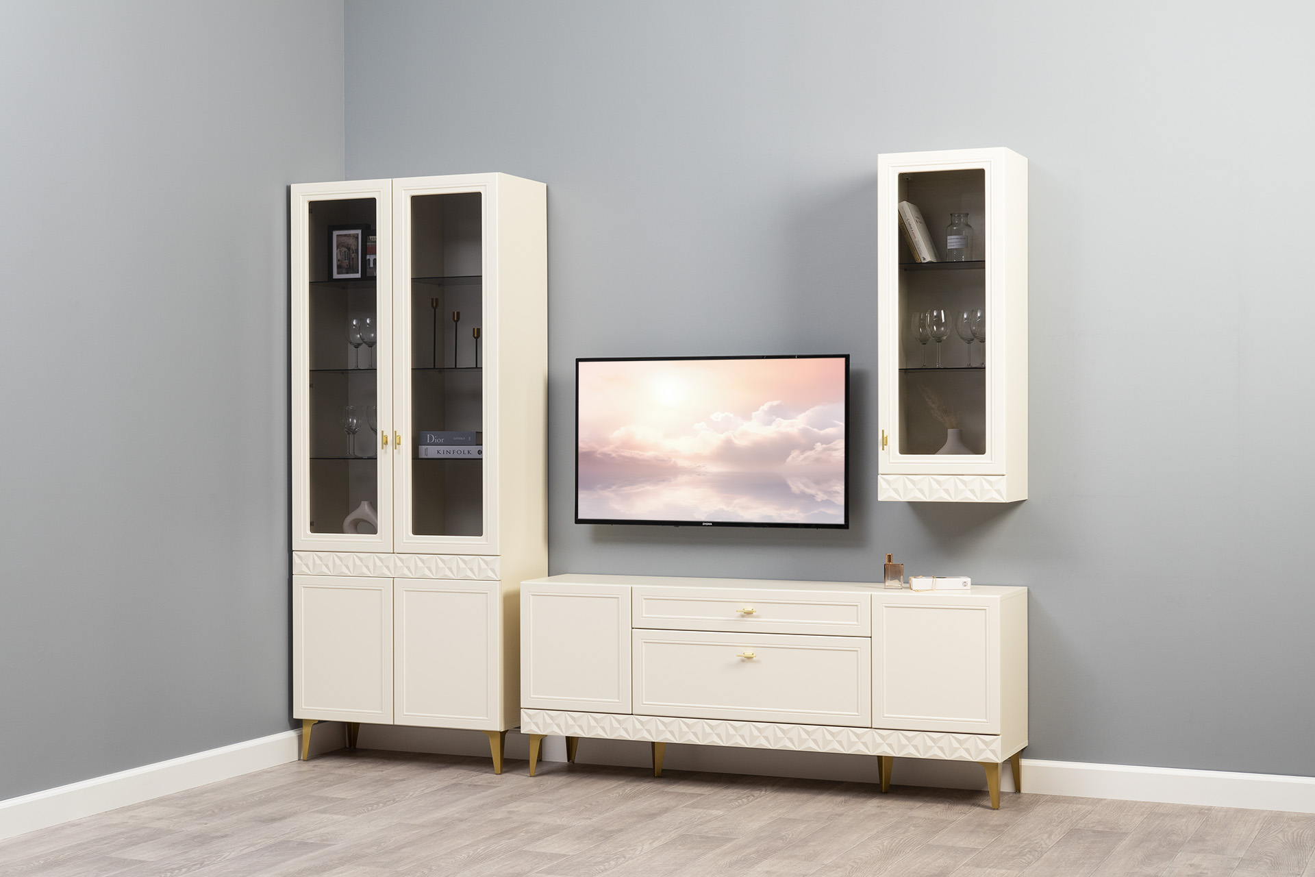 Гостиная Марион композиция 1 слоновая кость С341 PE, слоновая кость 6898 ПВХ, белый PE шагрень (собирается на любую сторону)