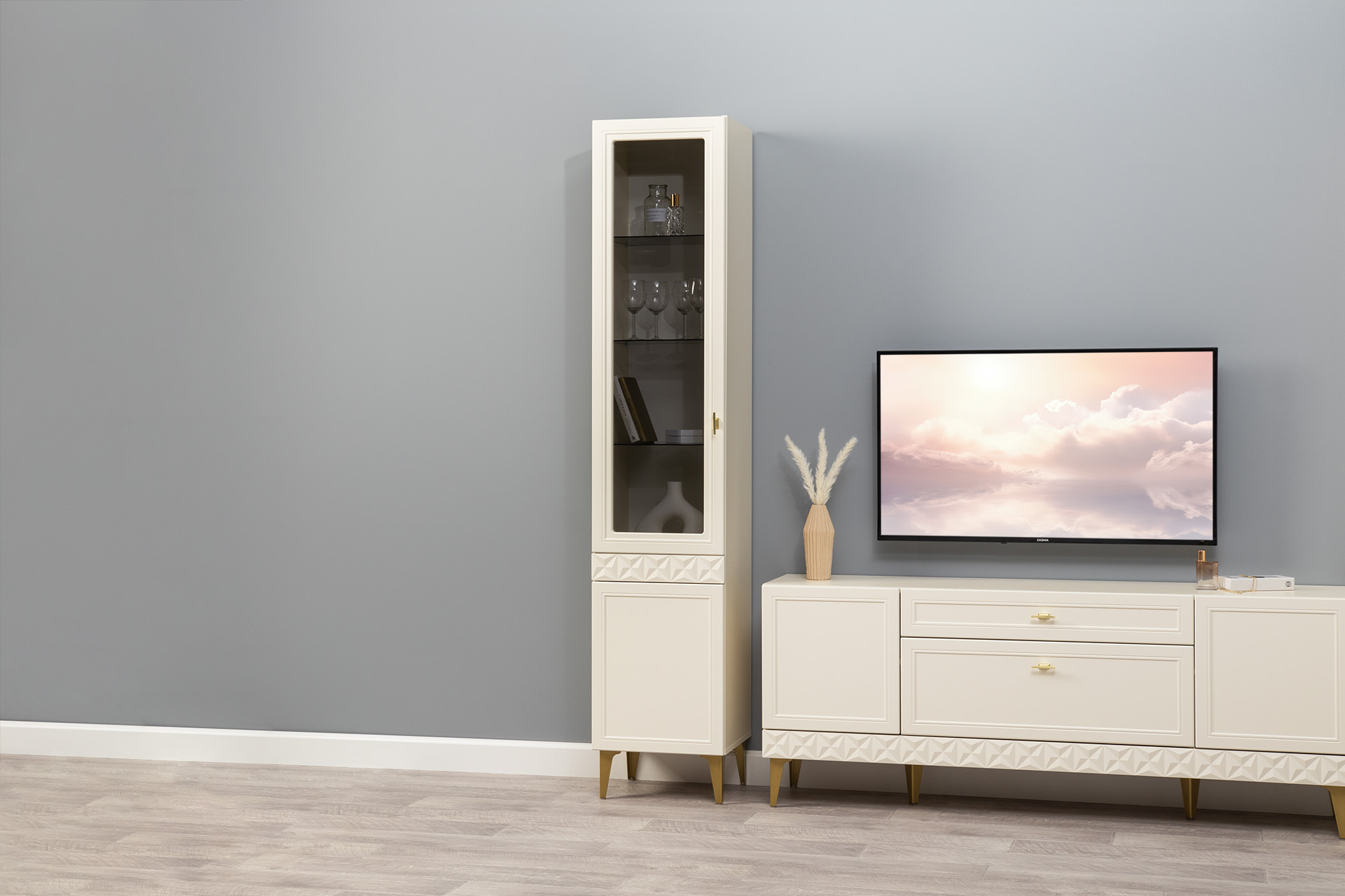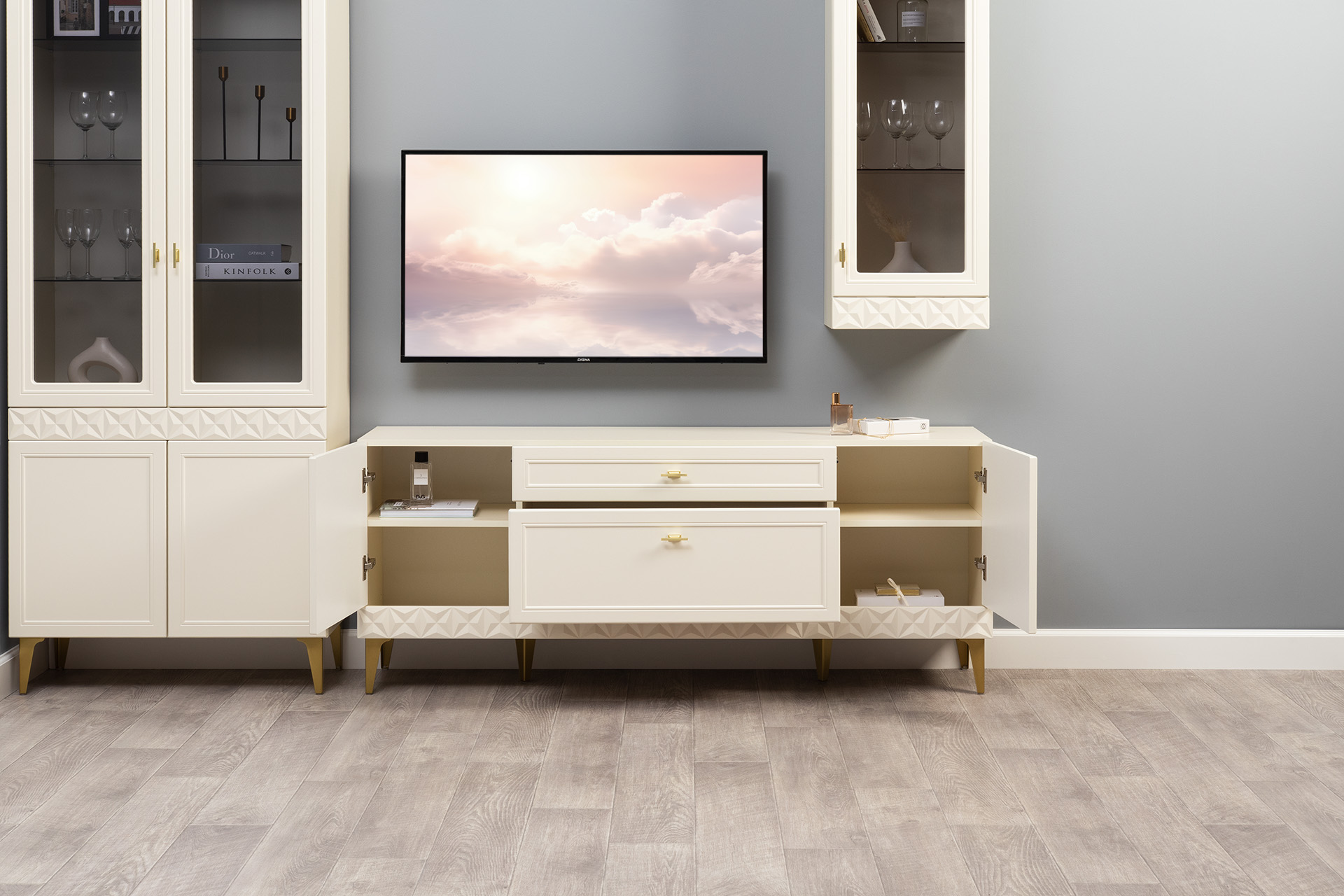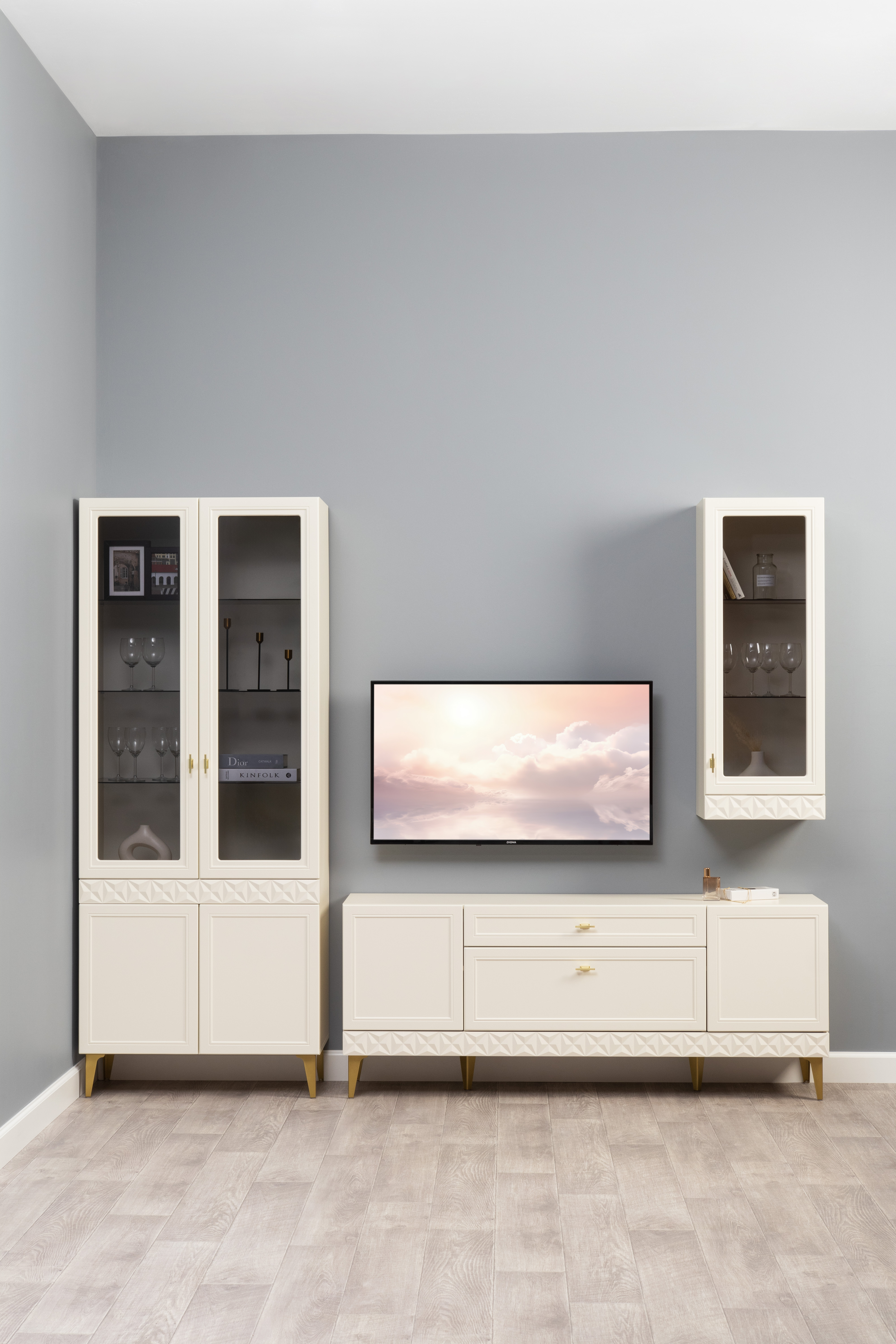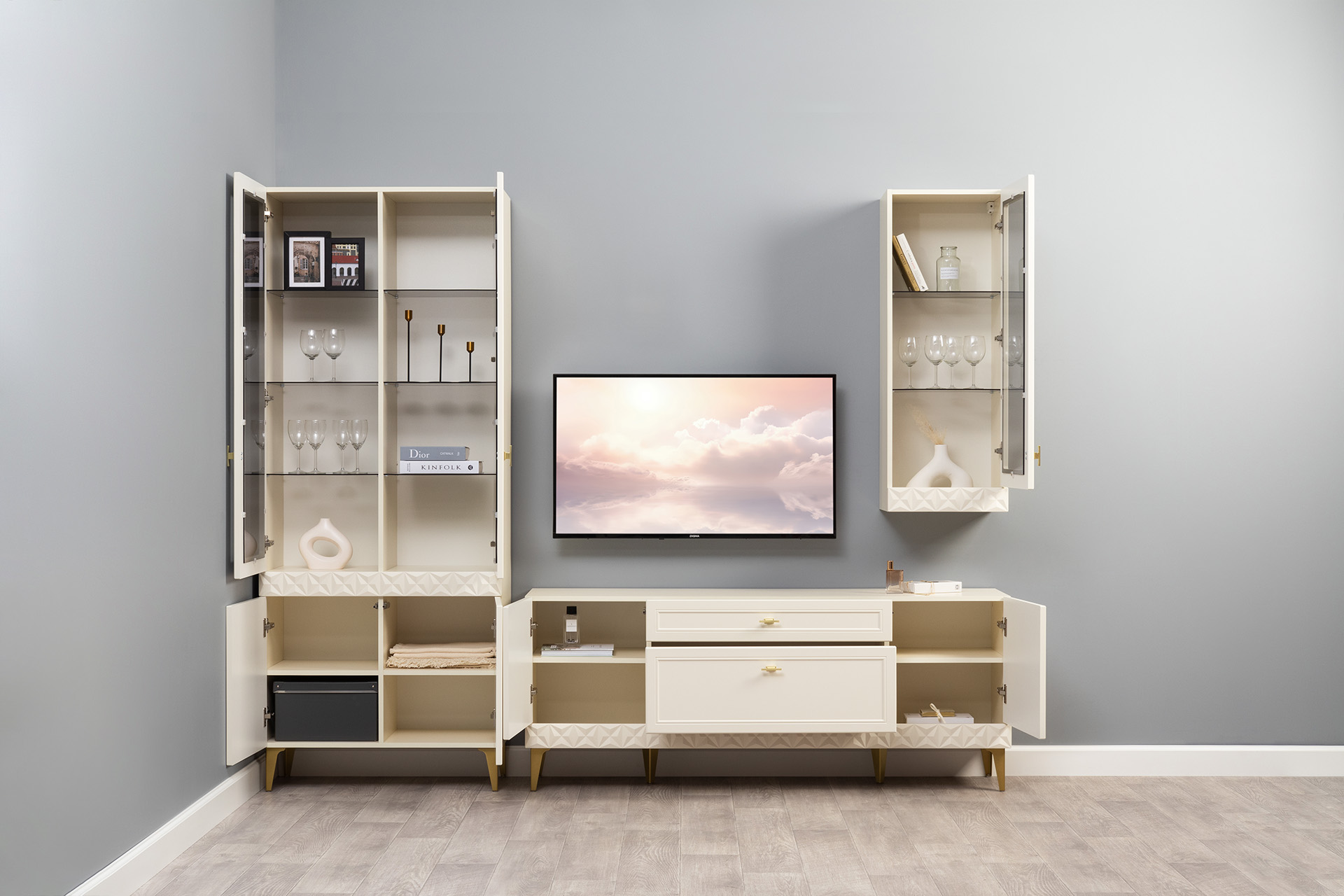 Гостиная Марион композиция 1 слоновая кость С341 PE, слоновая кость 6898 ПВХ, белый PE шагрень (собирается на любую сторону)