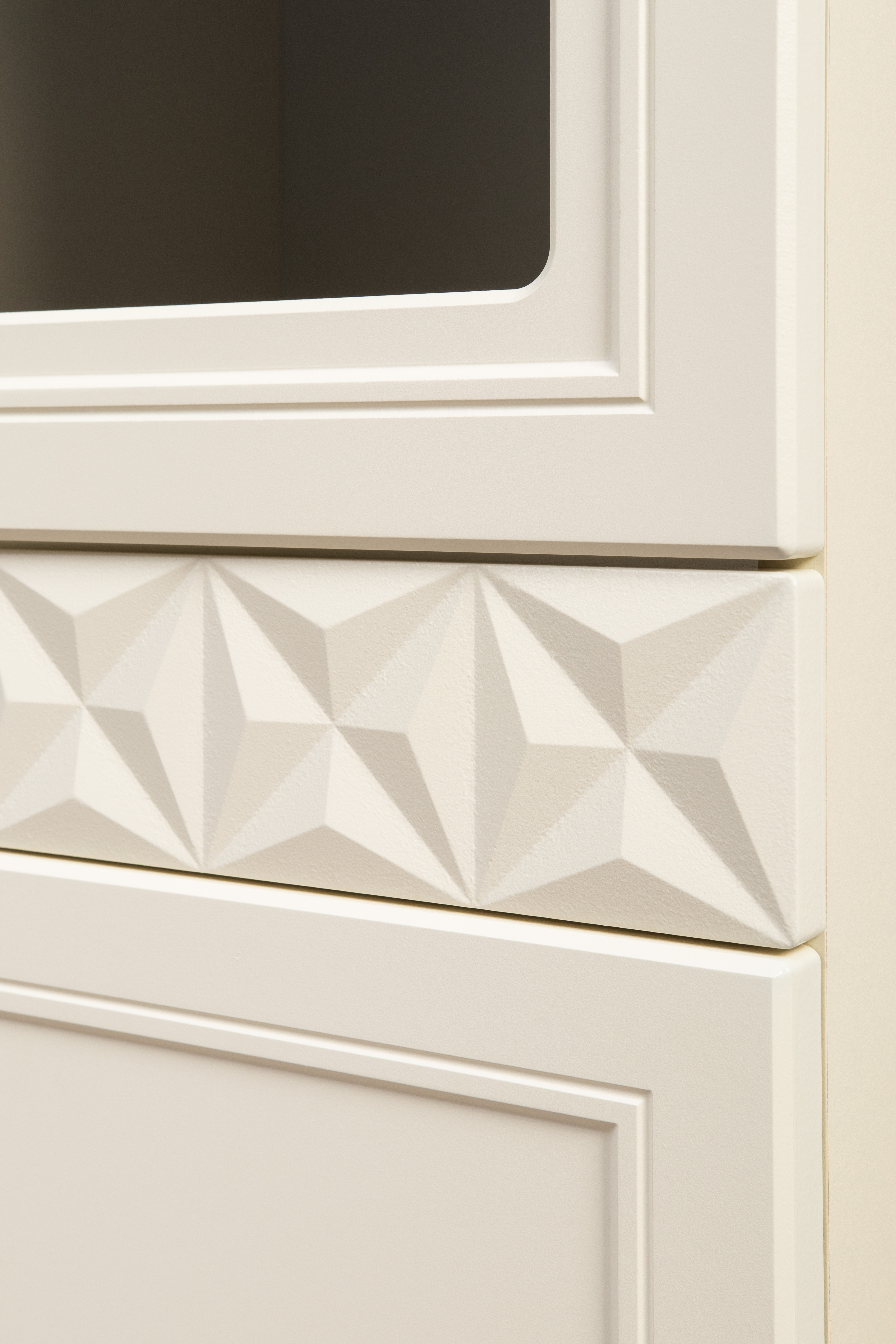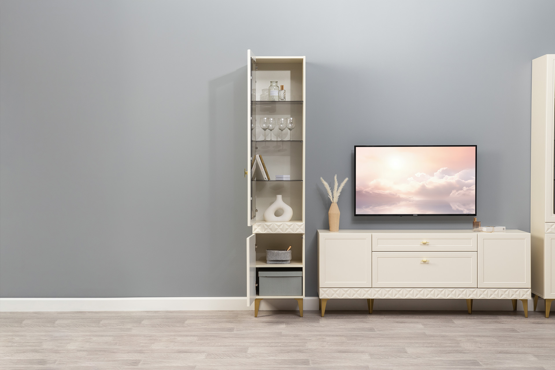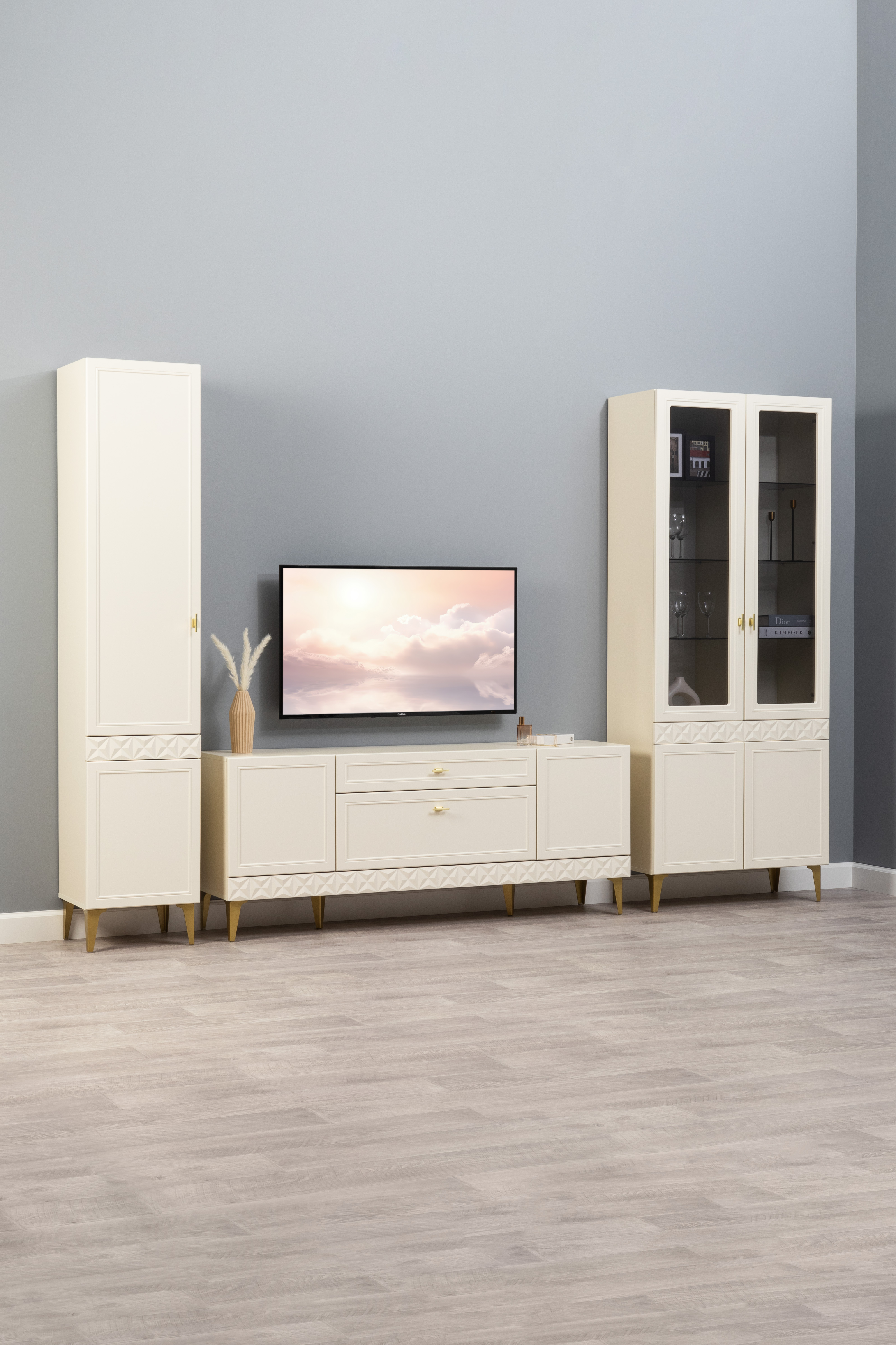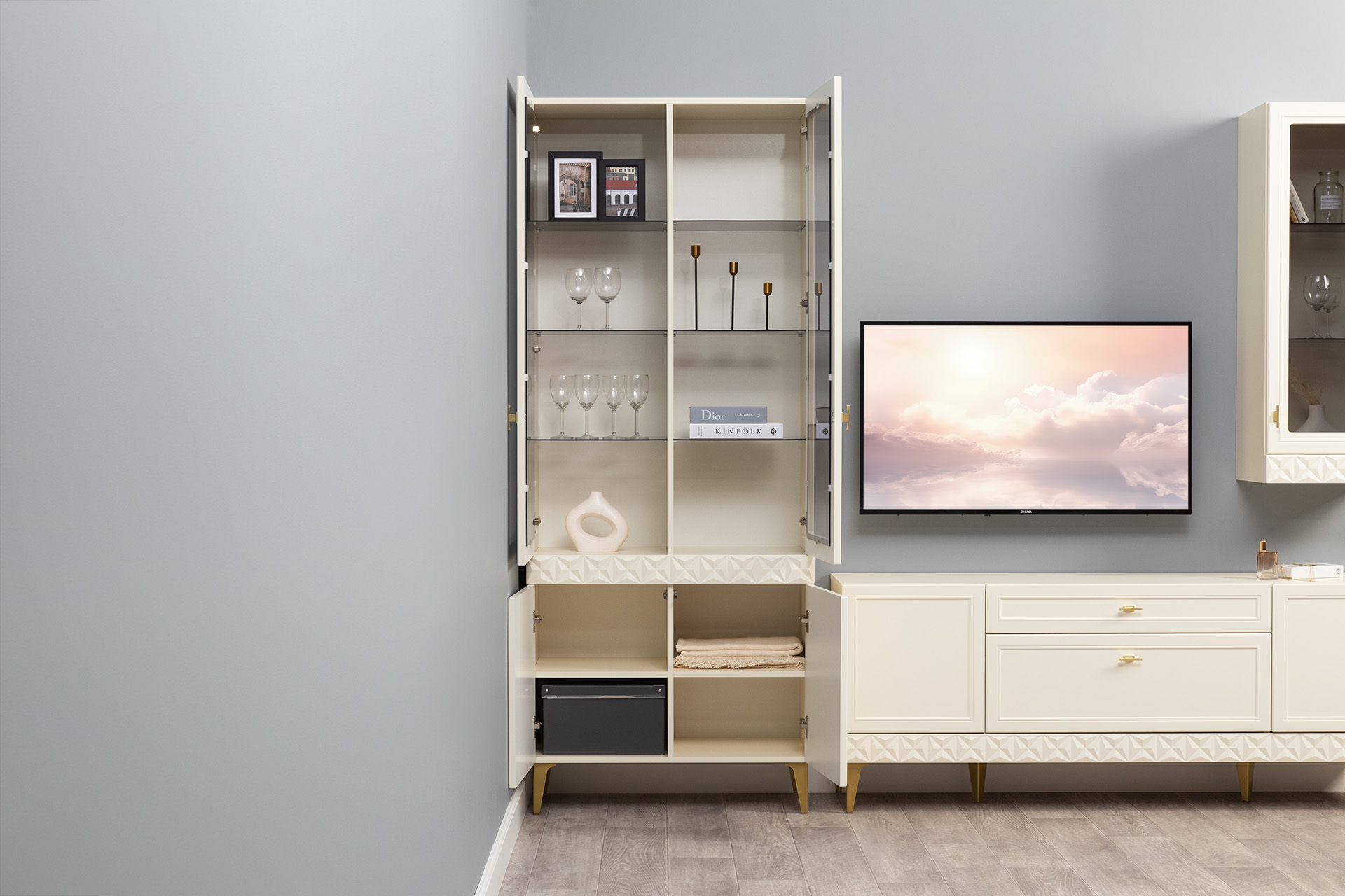 Гостиная Марион композиция 1 слоновая кость С341 PE, слоновая кость 6898 ПВХ, белый PE шагрень (собирается на любую сторону)