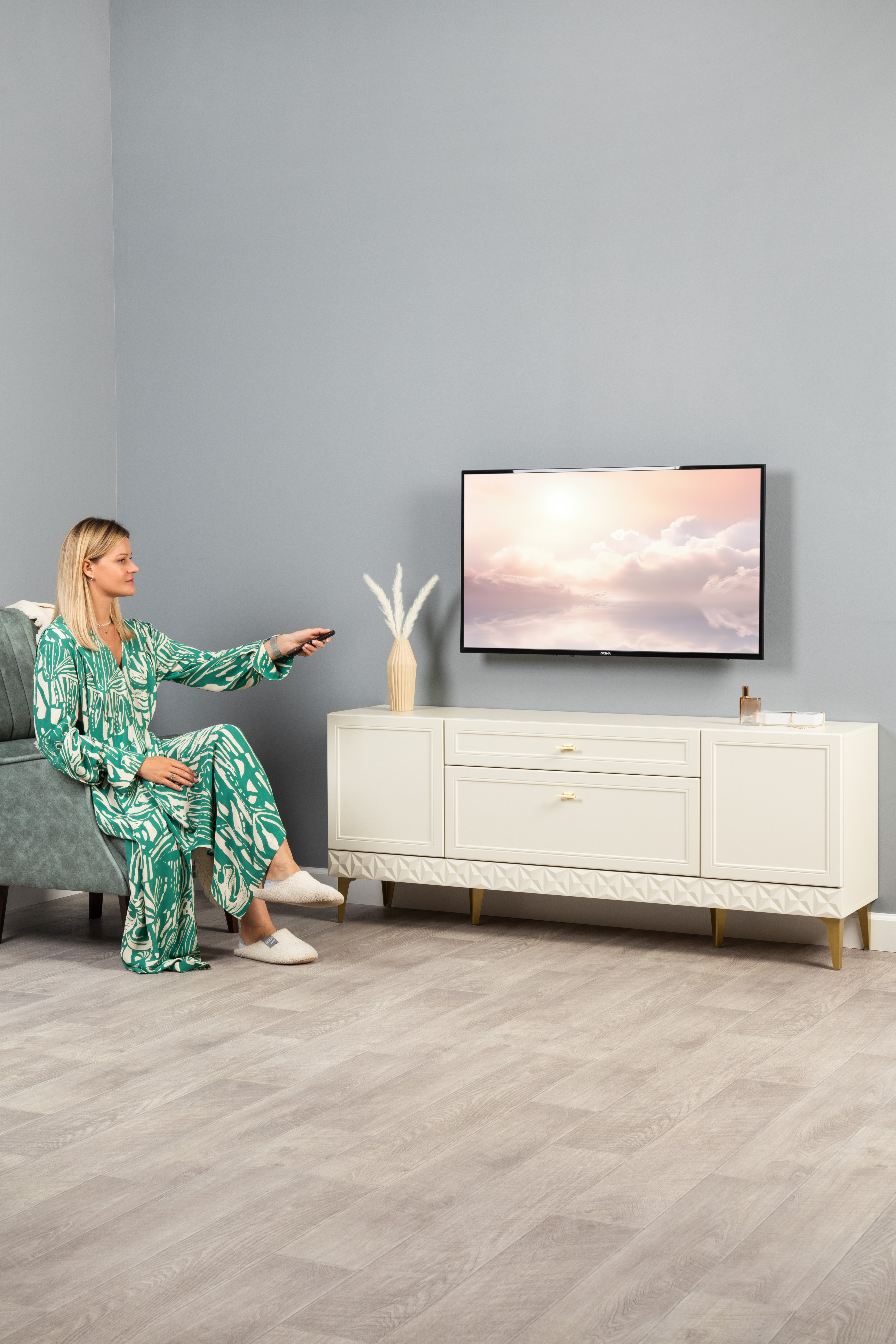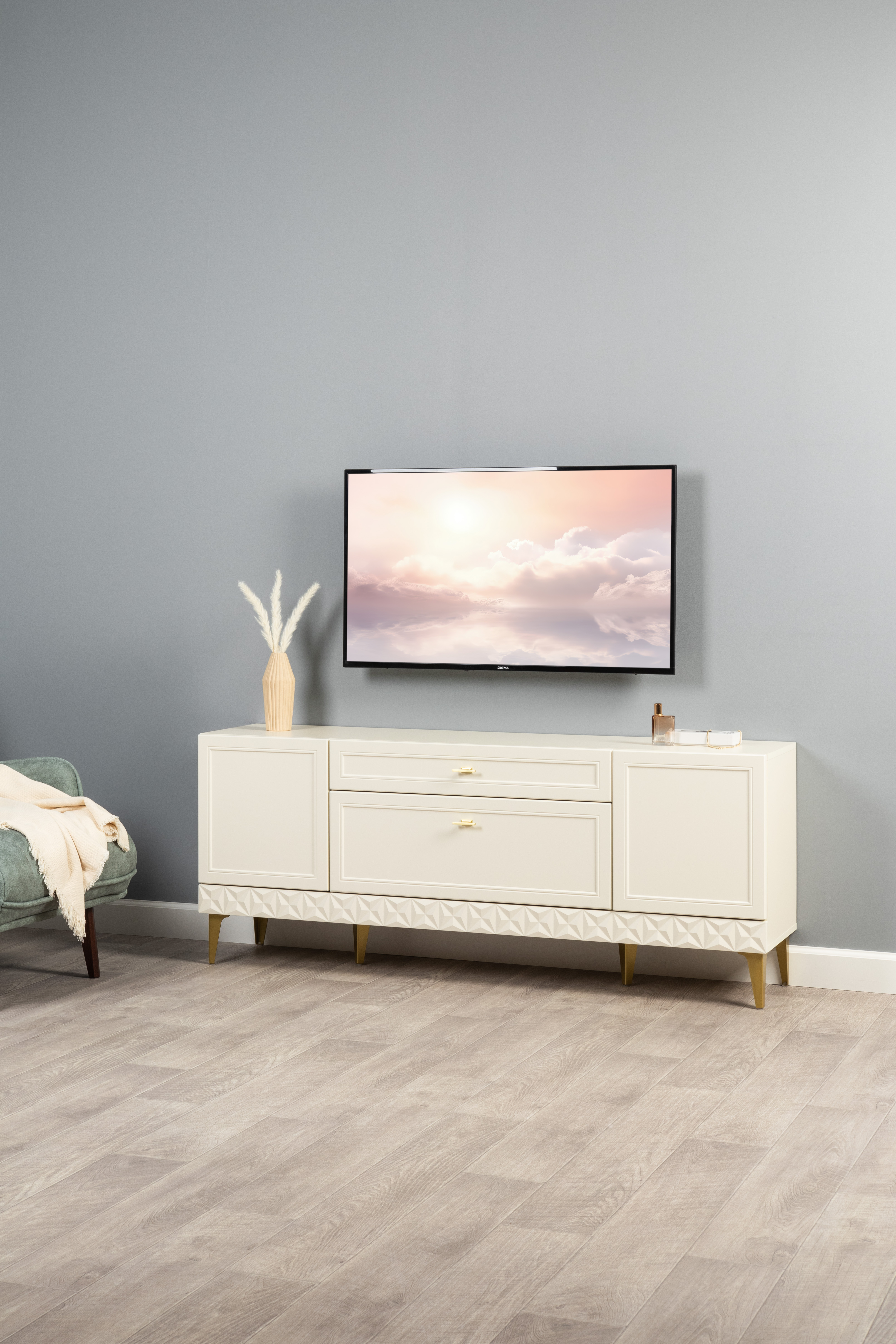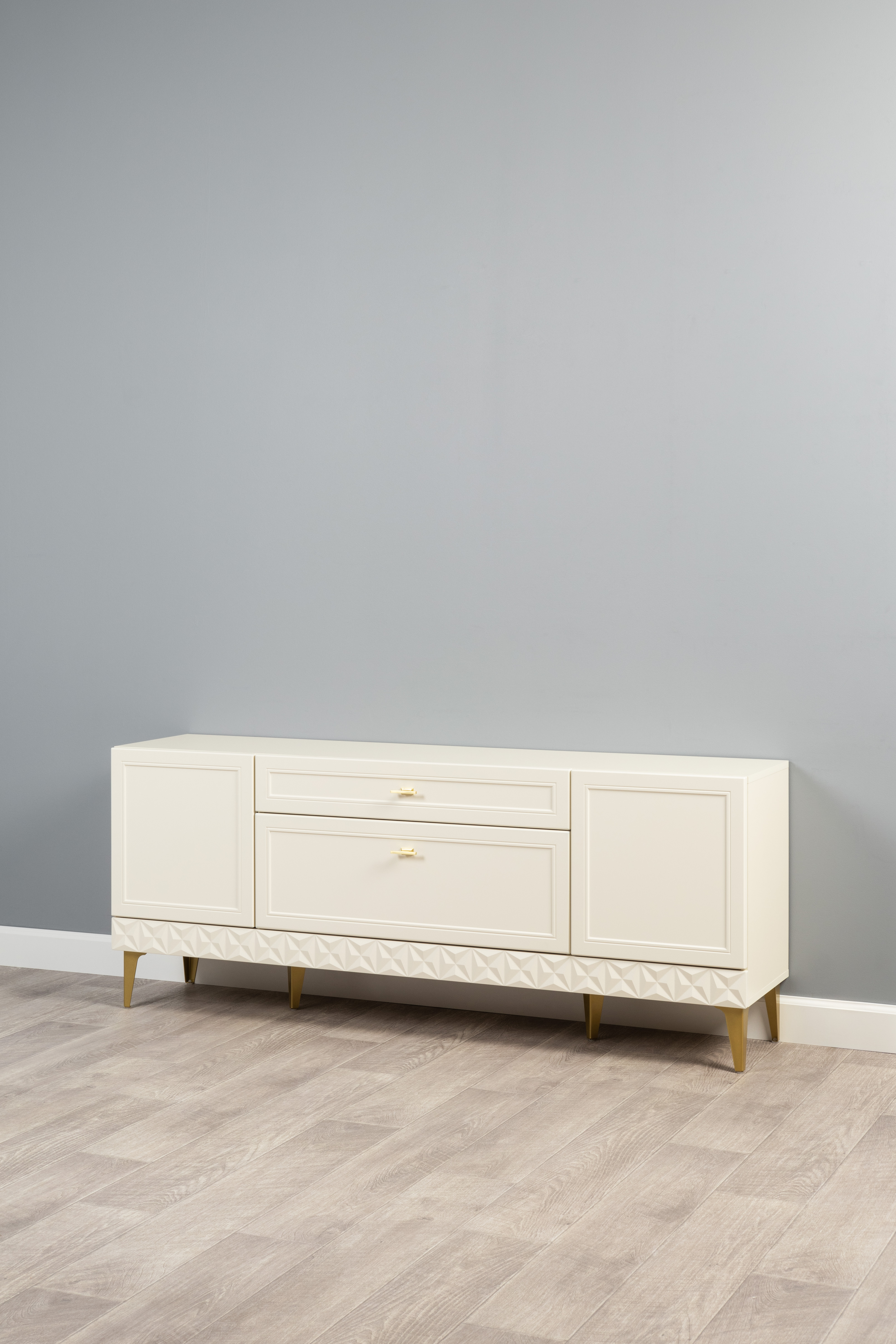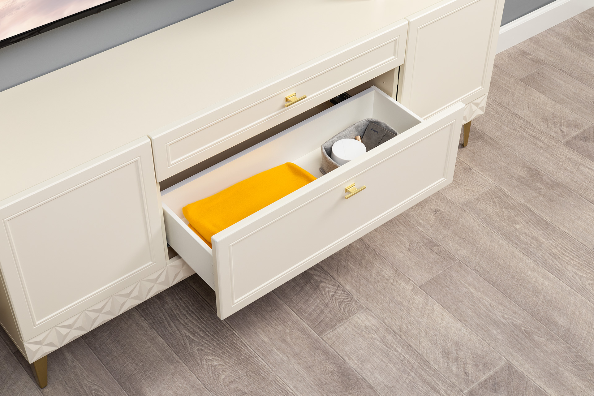 Гостиная Марион композиция 1 слоновая кость С341 PE, слоновая кость 6898 ПВХ, белый PE шагрень (собирается на любую сторону)