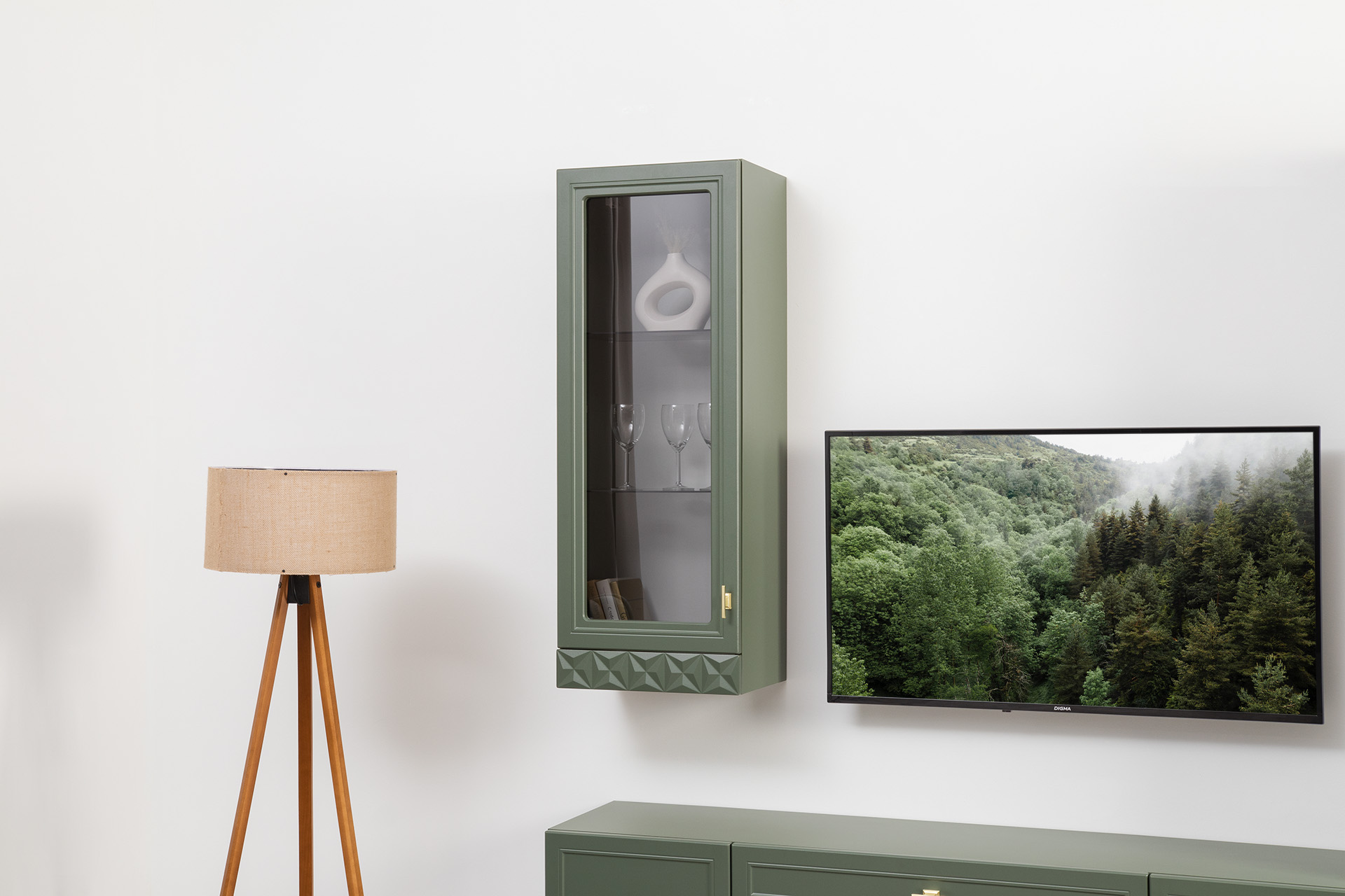 Шкаф-витрина Марион 16.397.01 дымчатый зеленый K521, олива шагрень AG 1050 ПВХ (собирается на любую сторону)