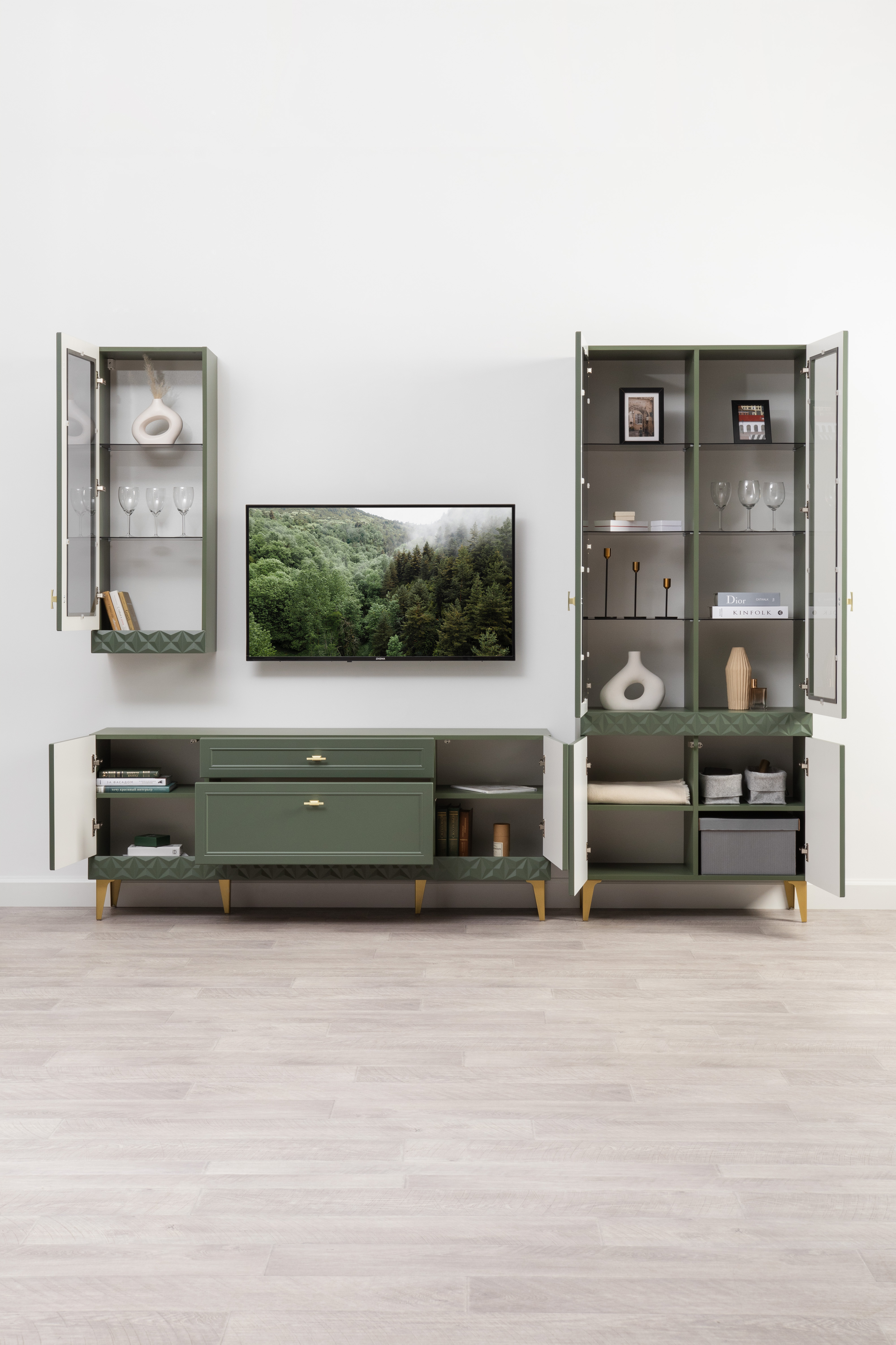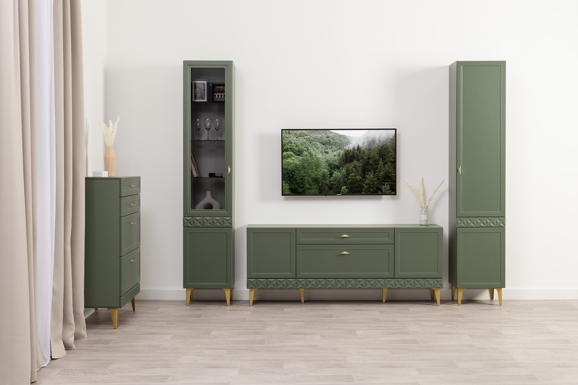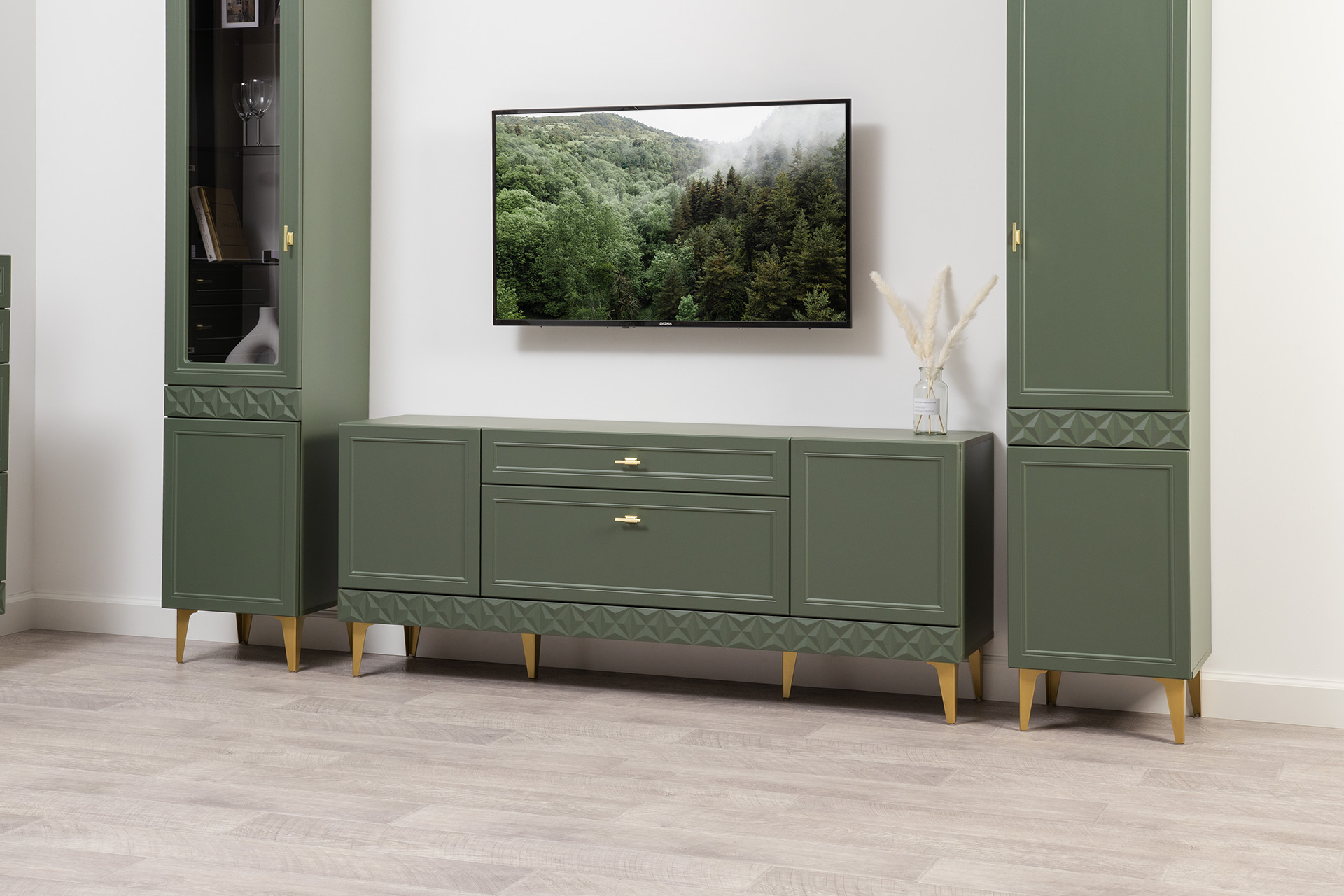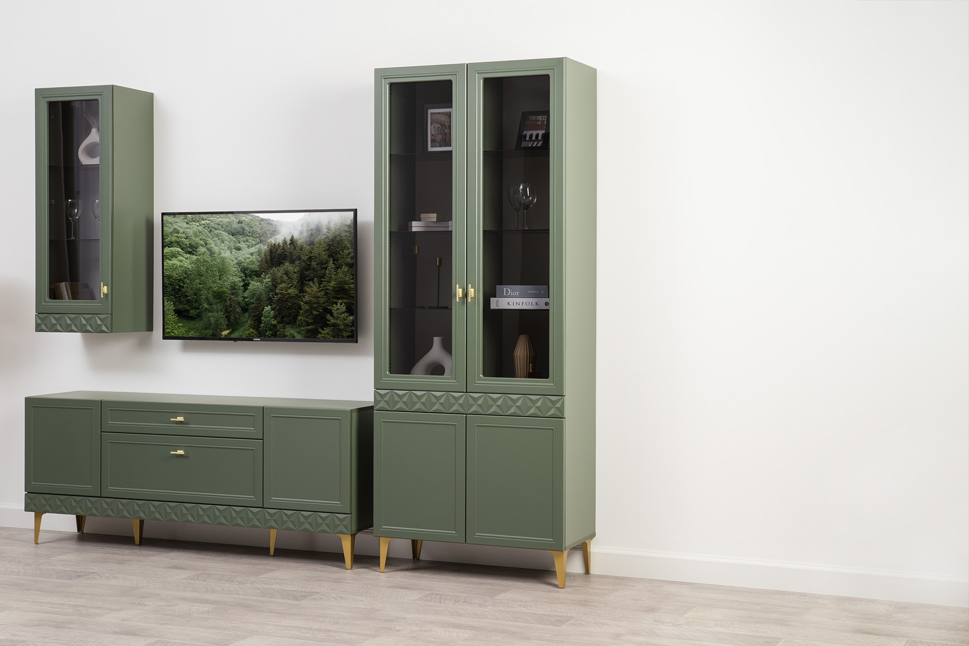 Гостиная Марион композиция 2 дымчатый зеленый K521, олива шагрень AG 1050 ПВХ, белый PE шагрень (собирается на любую сторону)