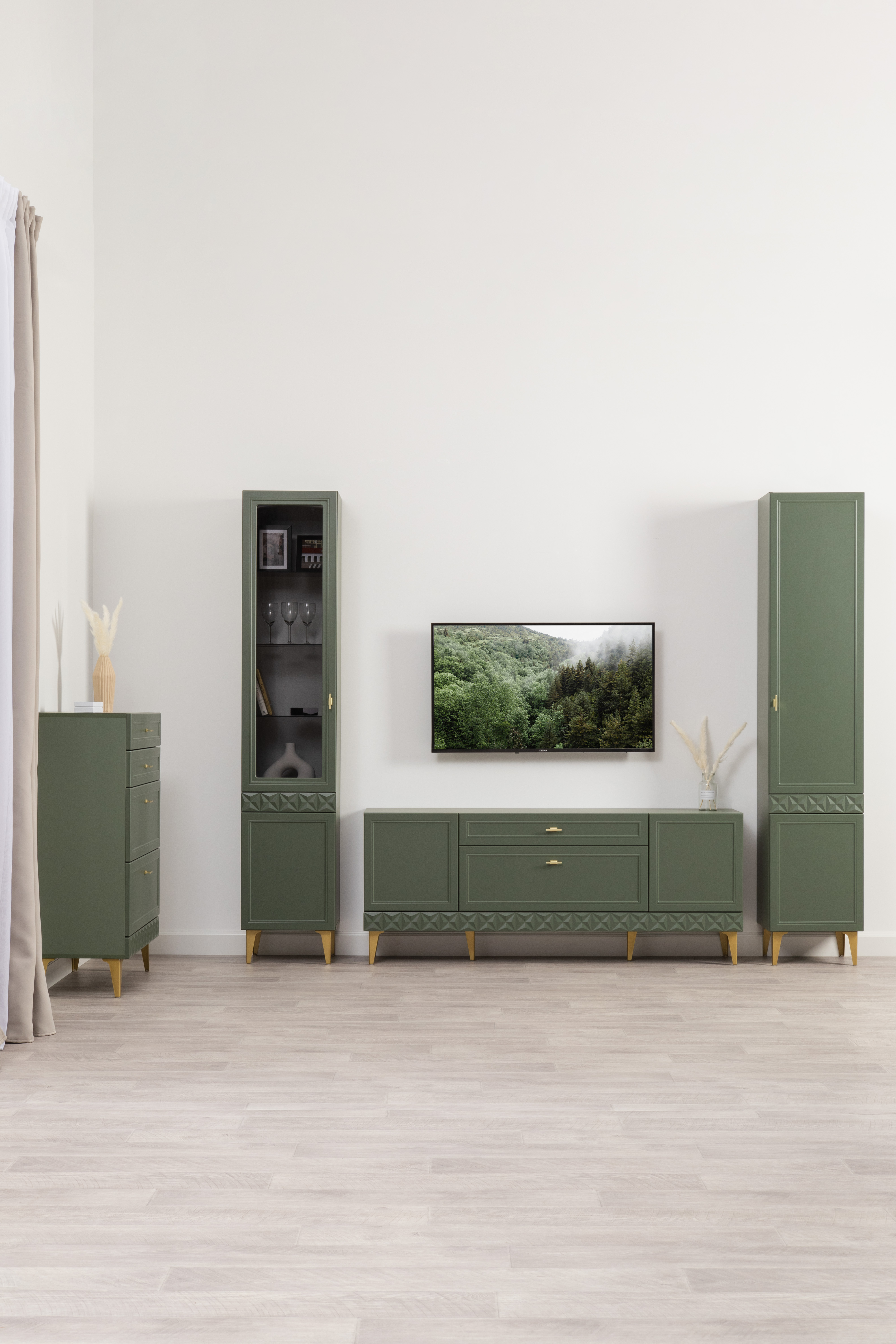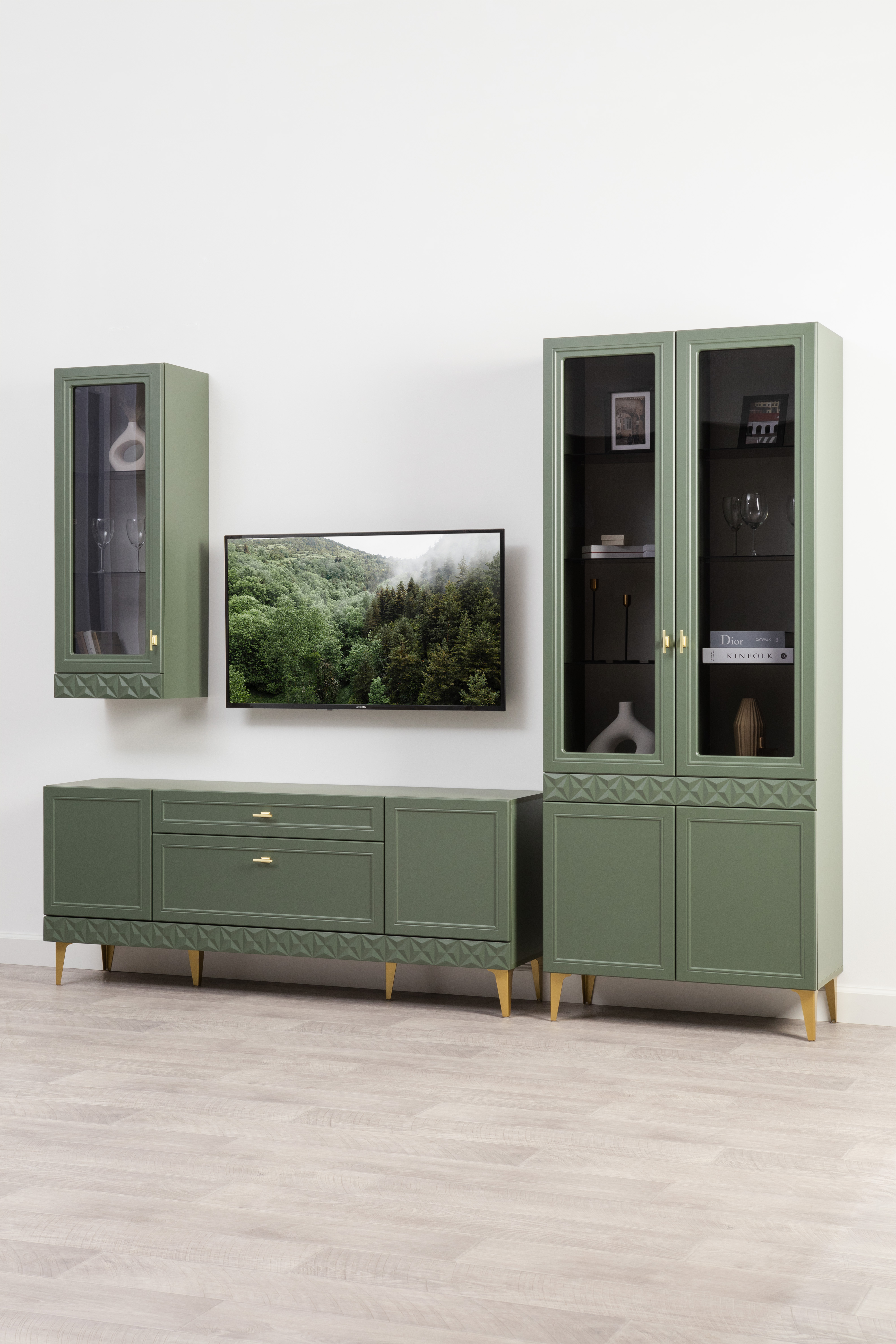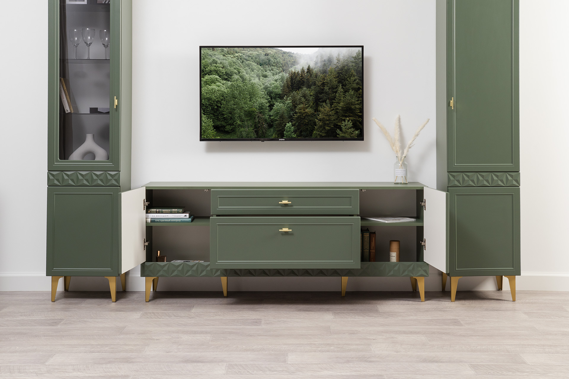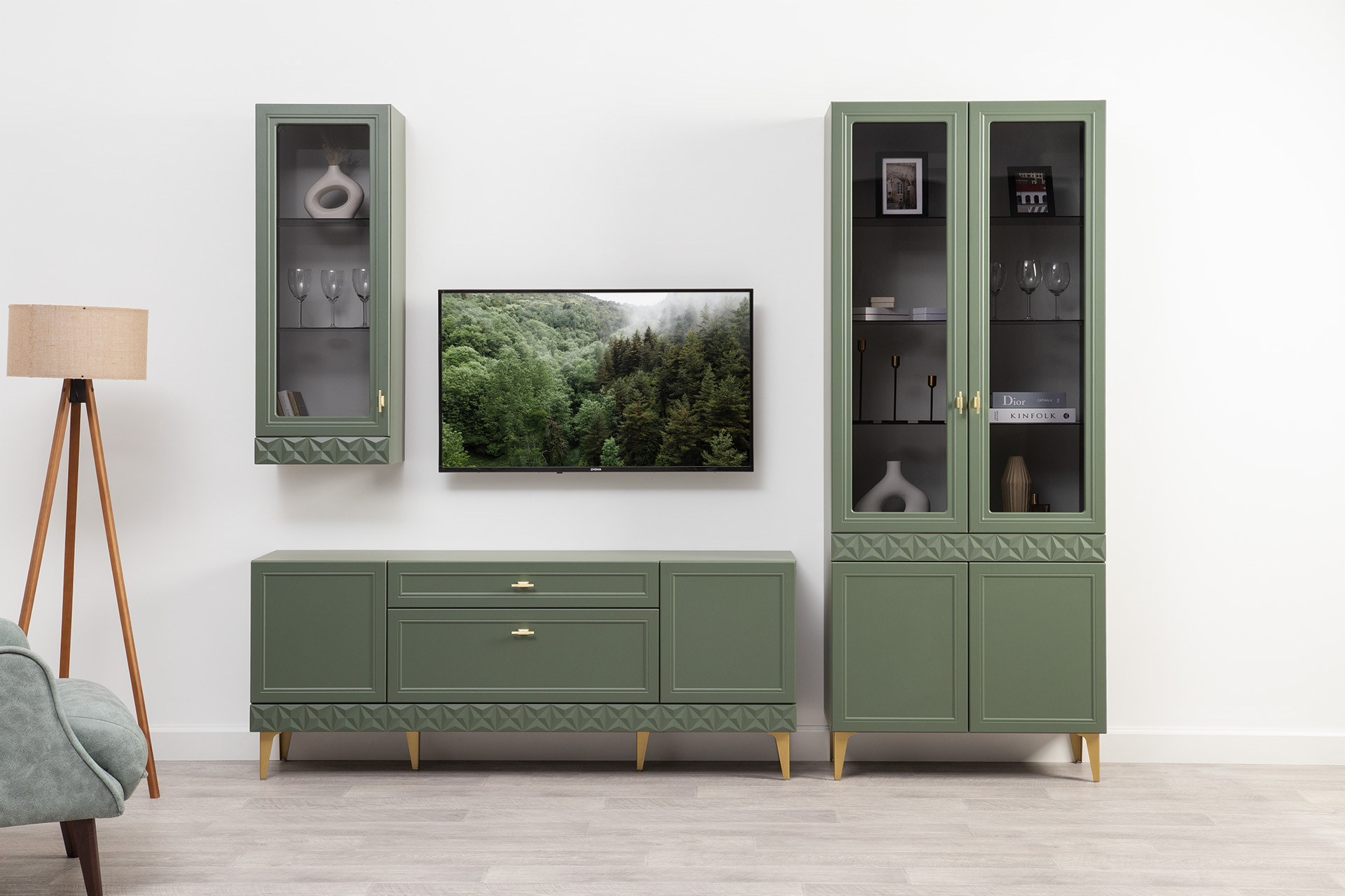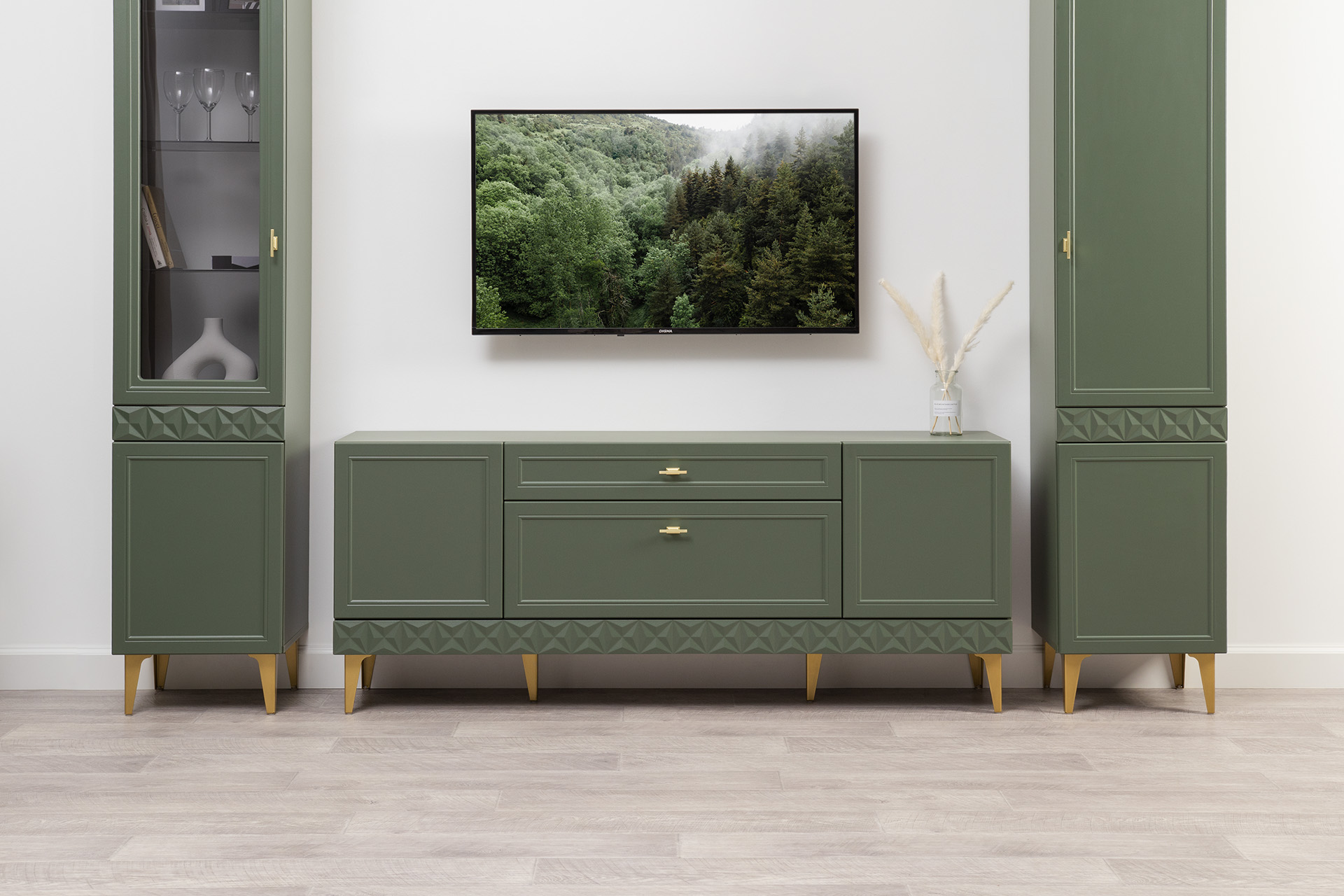 Гостиная Марион композиция 2 дымчатый зеленый K521, олива шагрень AG 1050 ПВХ, белый PE шагрень (собирается на любую сторону)