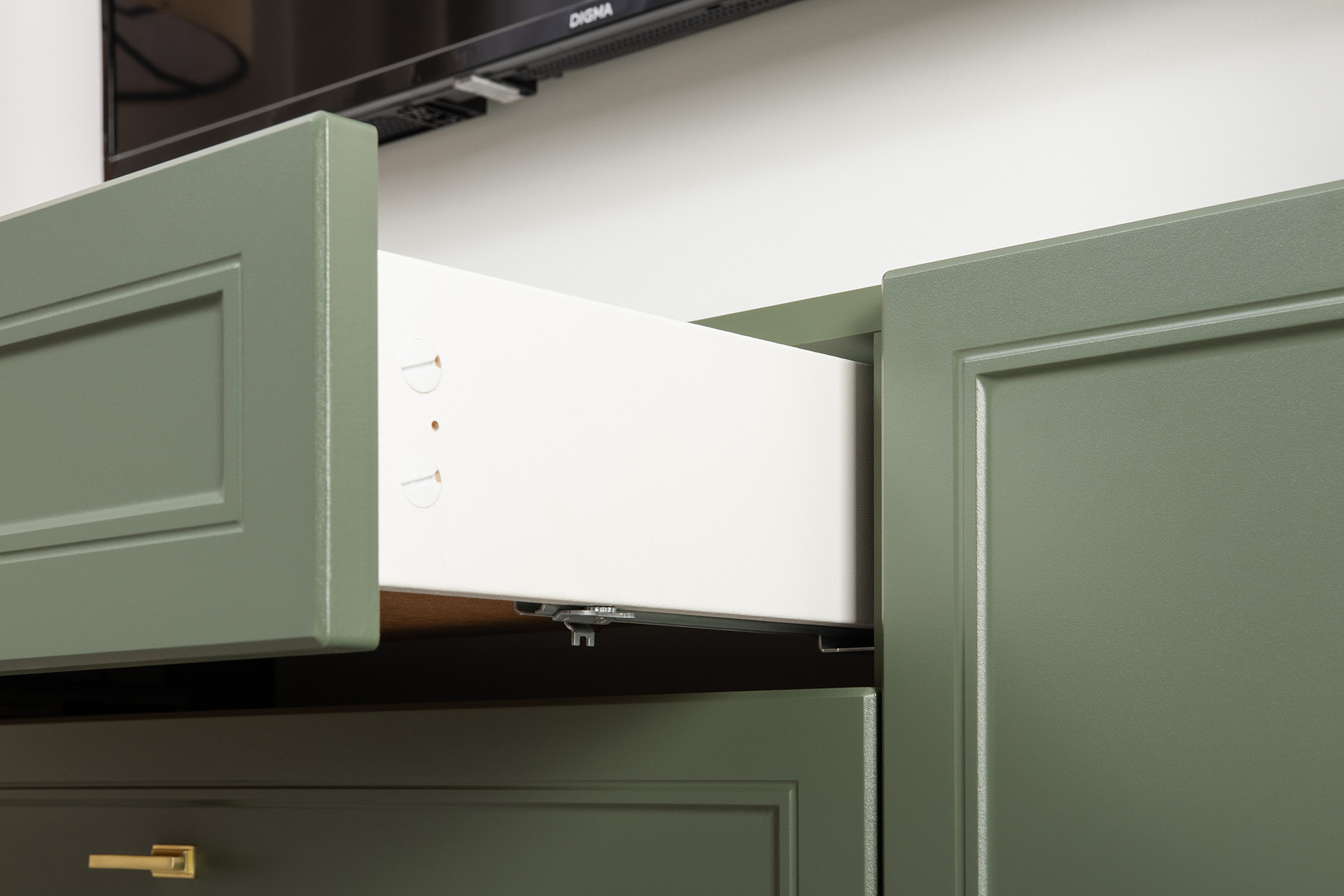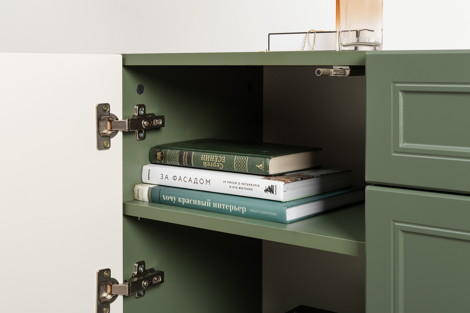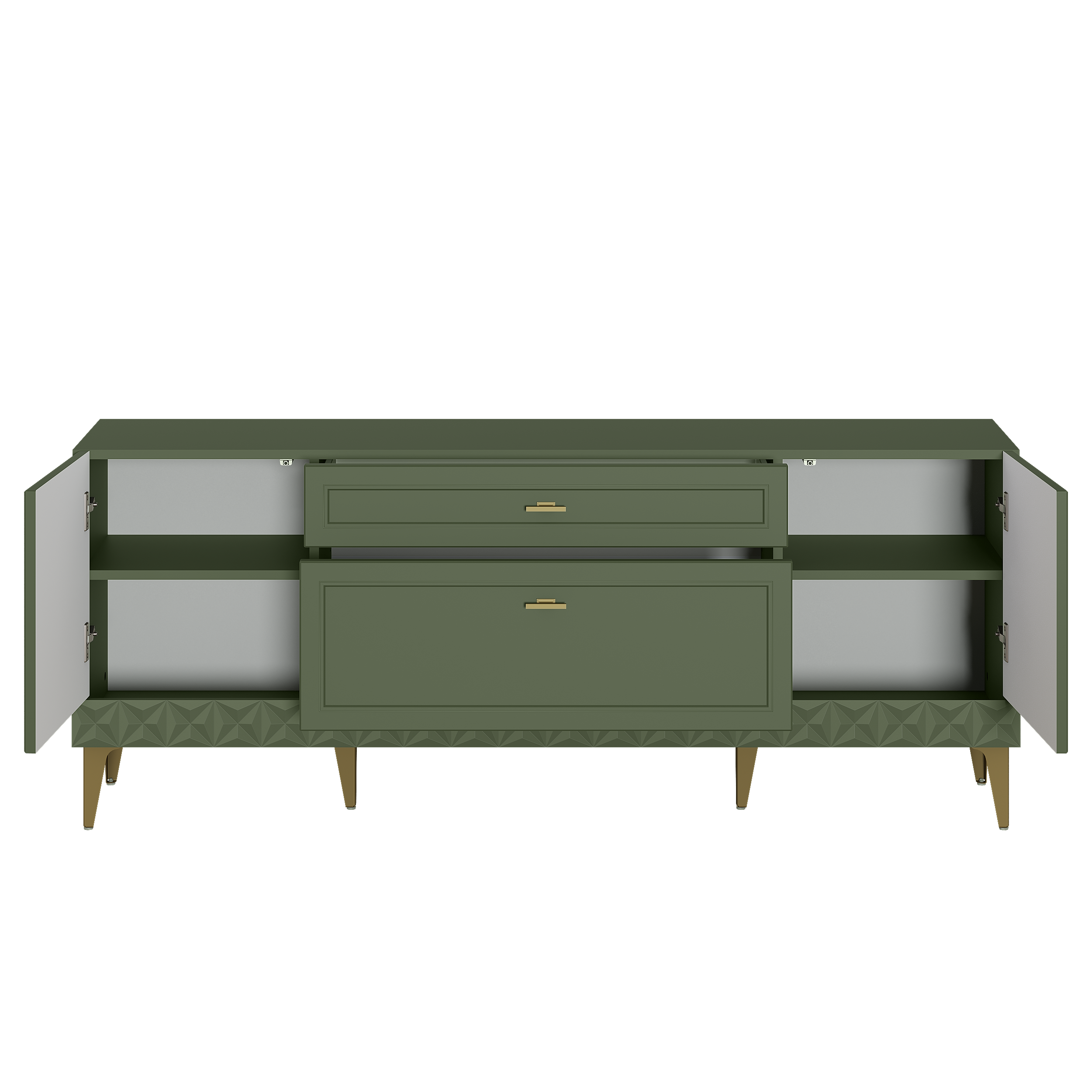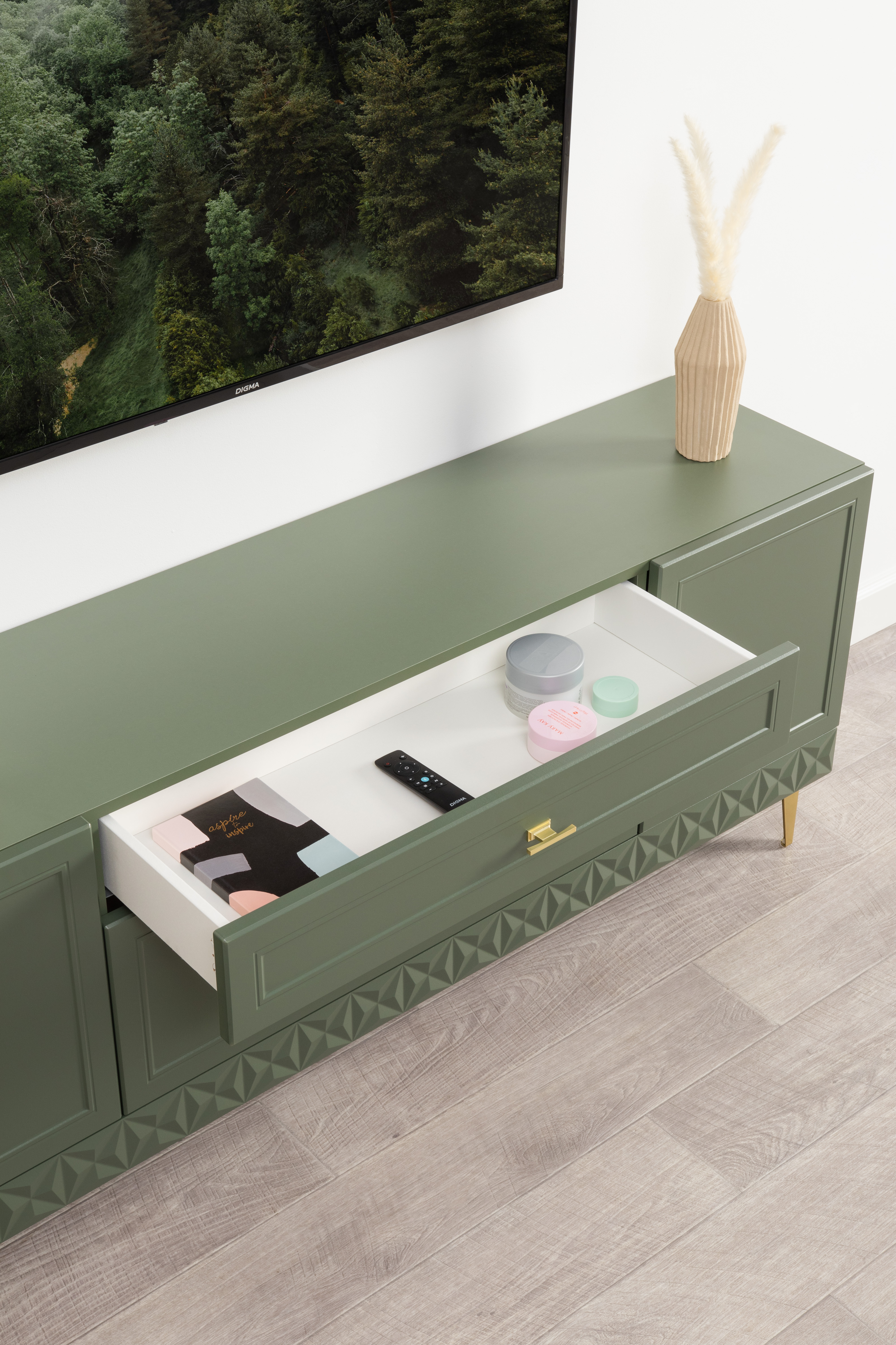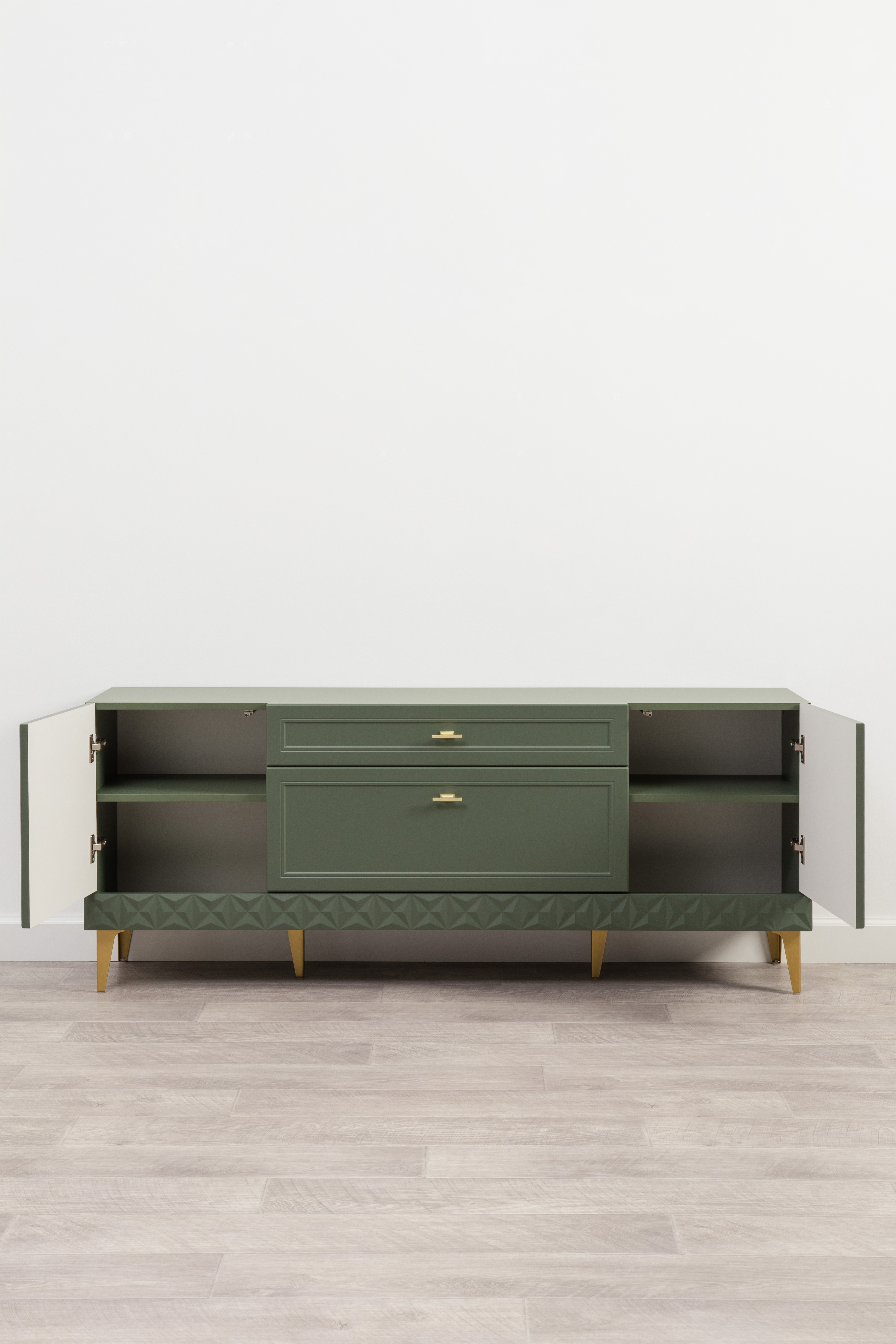 Комод Марион 16.249 дымчатый зеленый K521, олива шагрень AG 1050 ПВХ, белый PE шагрень