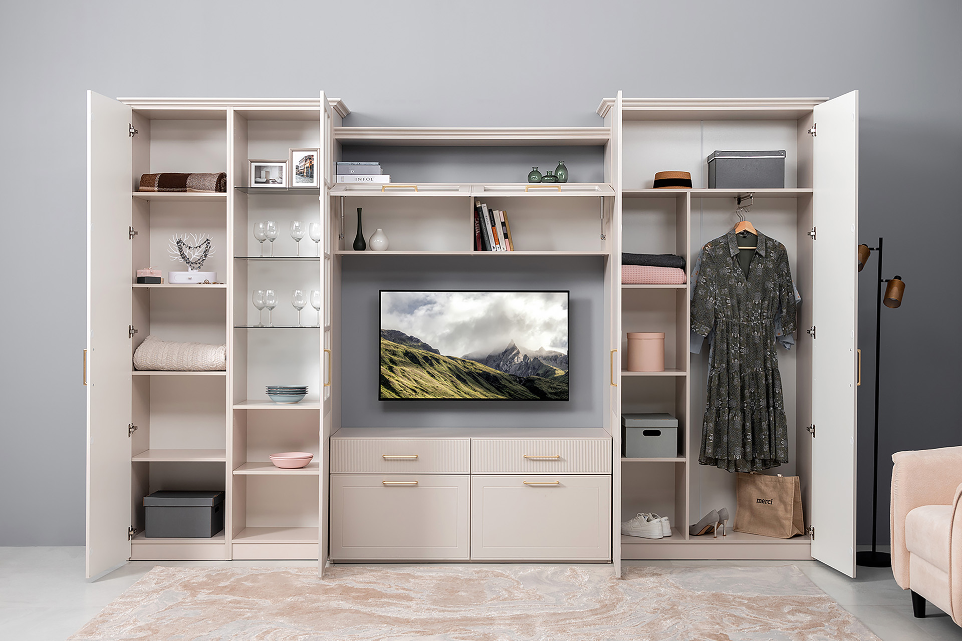 Гостиная Ричфорд композиция 1 с карнизами, кашемир 5981 BS, моно керамика D166-2 ПВХ, белый PE шагрень (собирается на любую сторону)