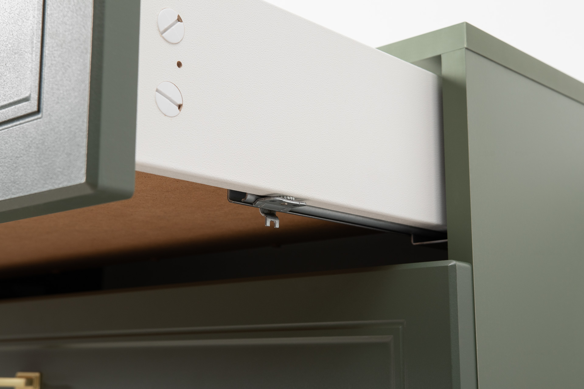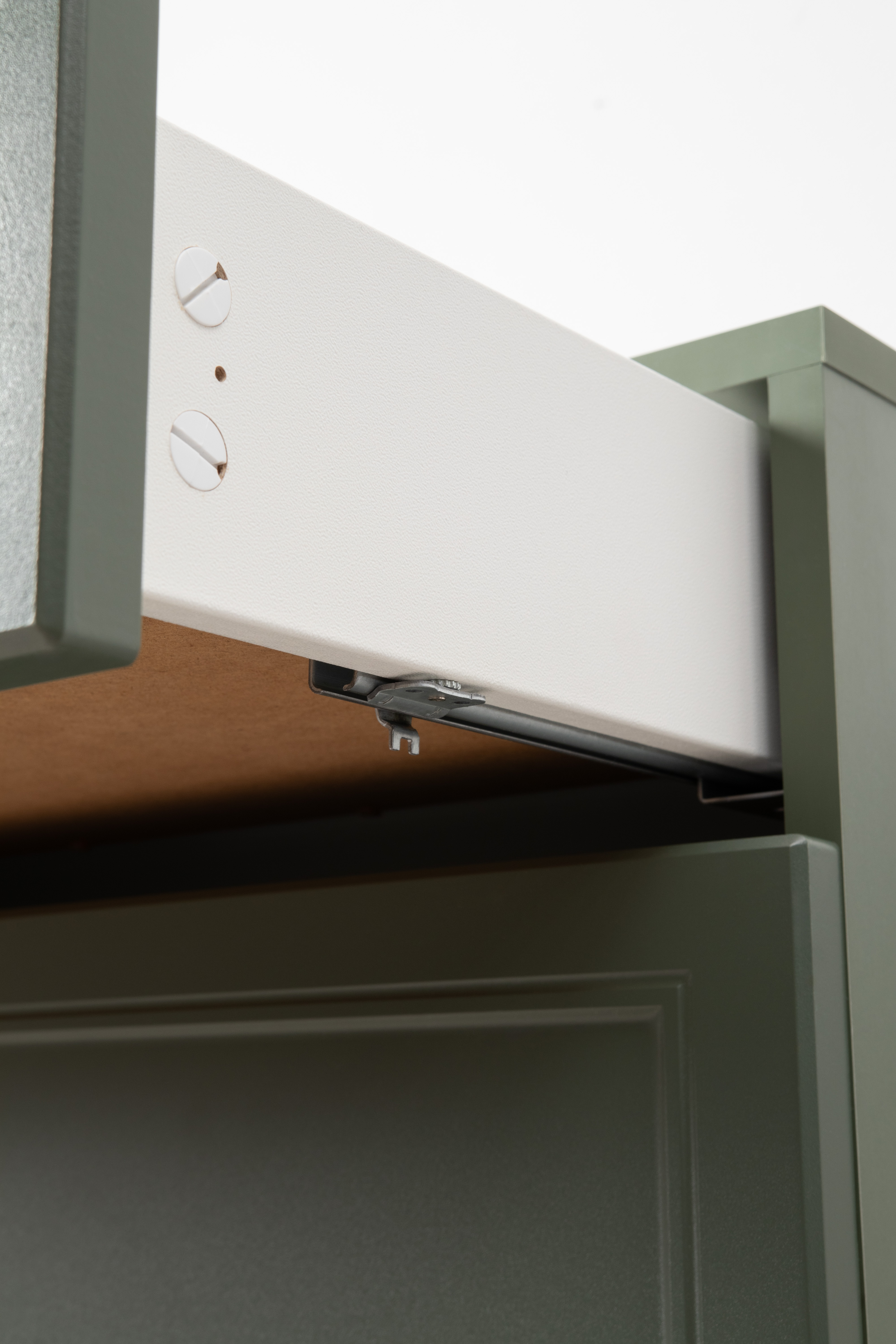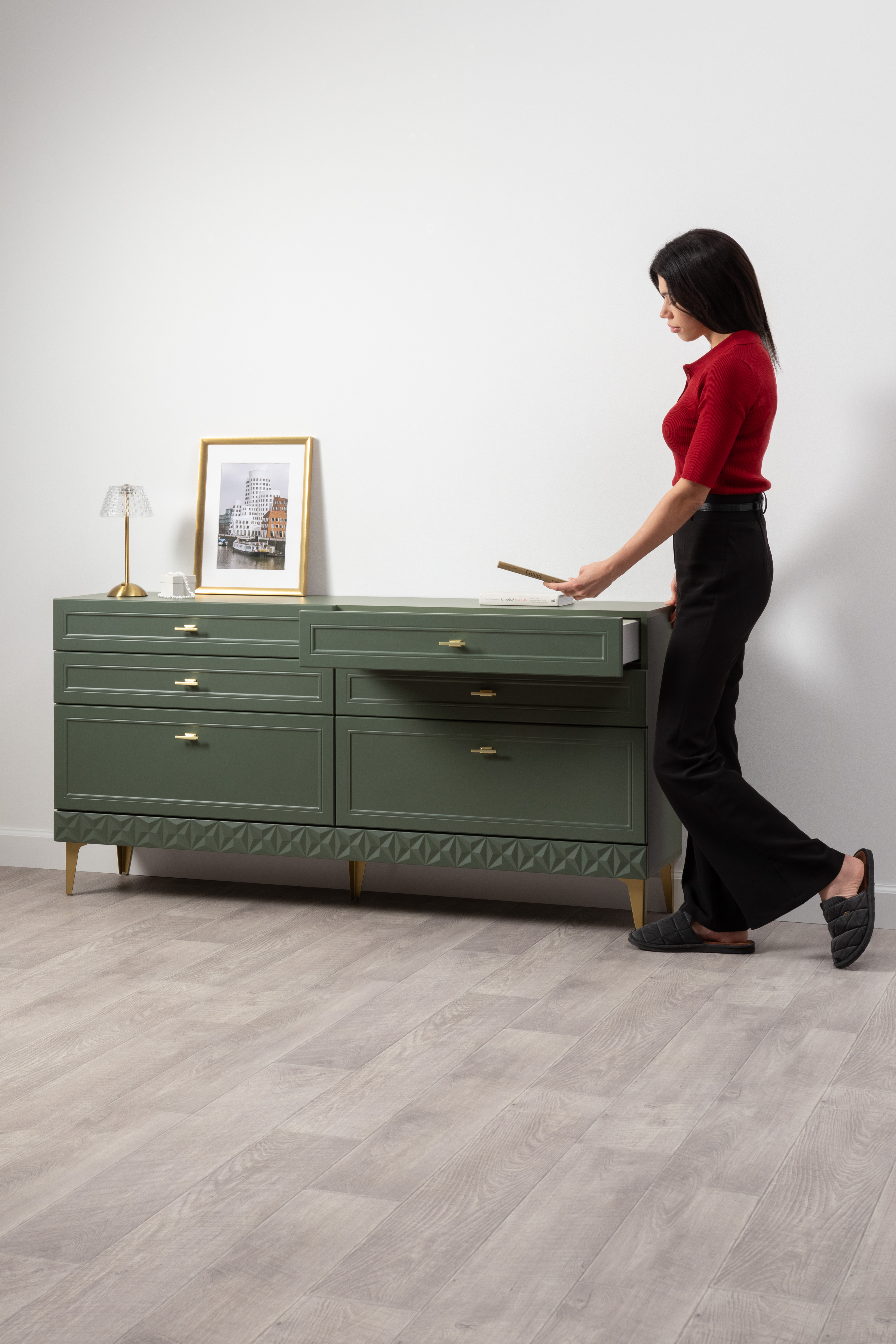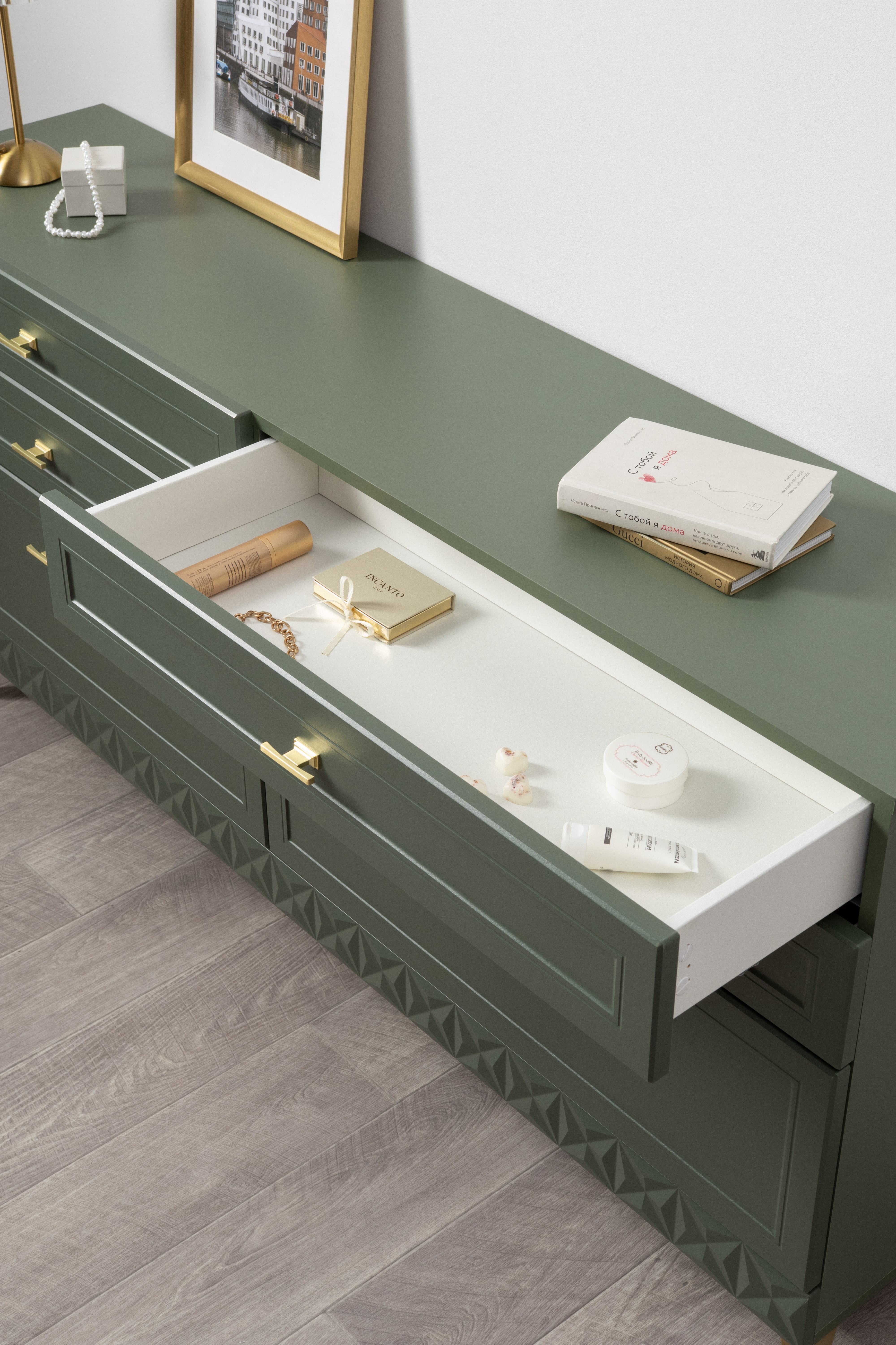 Комод Марион 16.256 дымчатый зеленый K521, олива шагрень AG 1050 ПВХ, белый PE шагрень