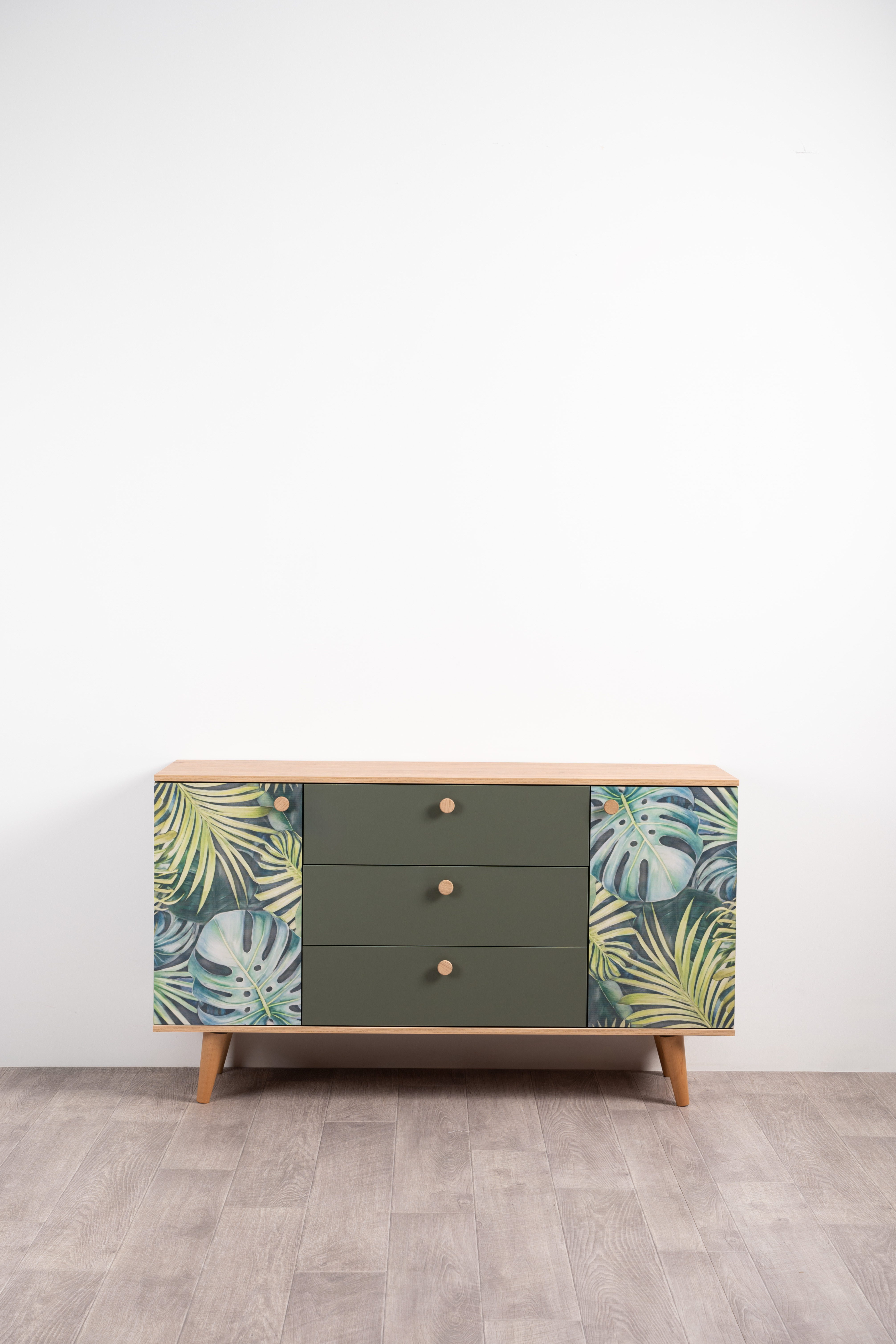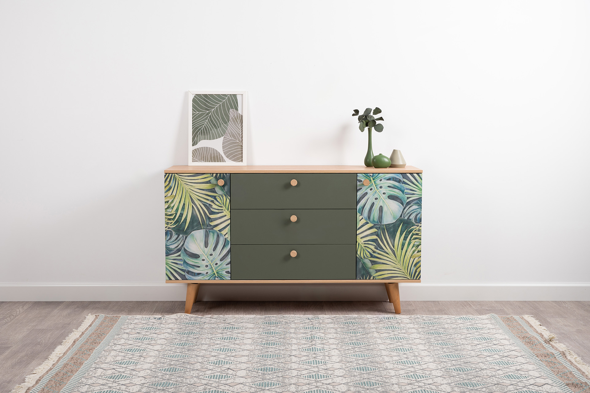 Комод Маттиас 16.245 дымчатый зеленый K521, гикори рокфорд натуральный KO86 PW, белый PE шагрень, фотопечать