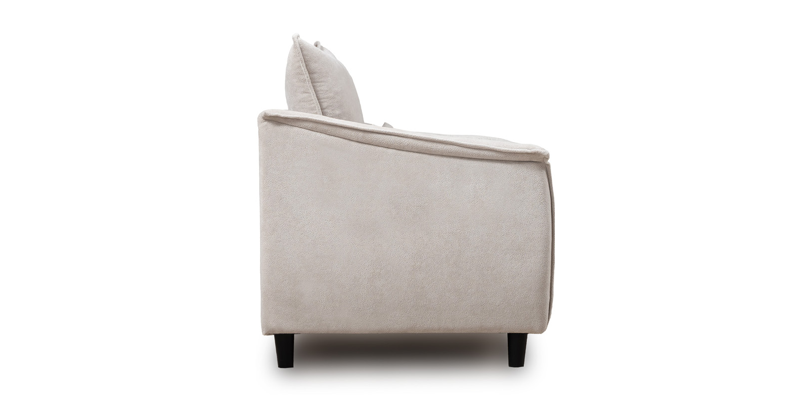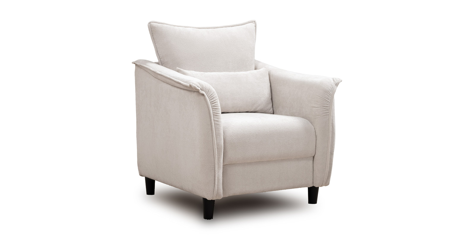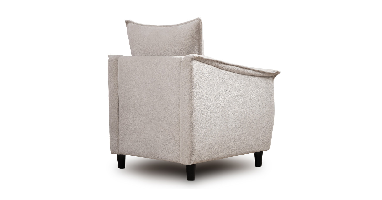 Кресло с приспинной подушкой трапецивидной формы на молнии, по трем сторонам которой проложена отделочная строчка на 1,2 см. По контуру боковин проложен декоративный кант на 1,2 см основной ткани. Кант проходит по центру передней части боковины, а по внутренней верхней части сборка.