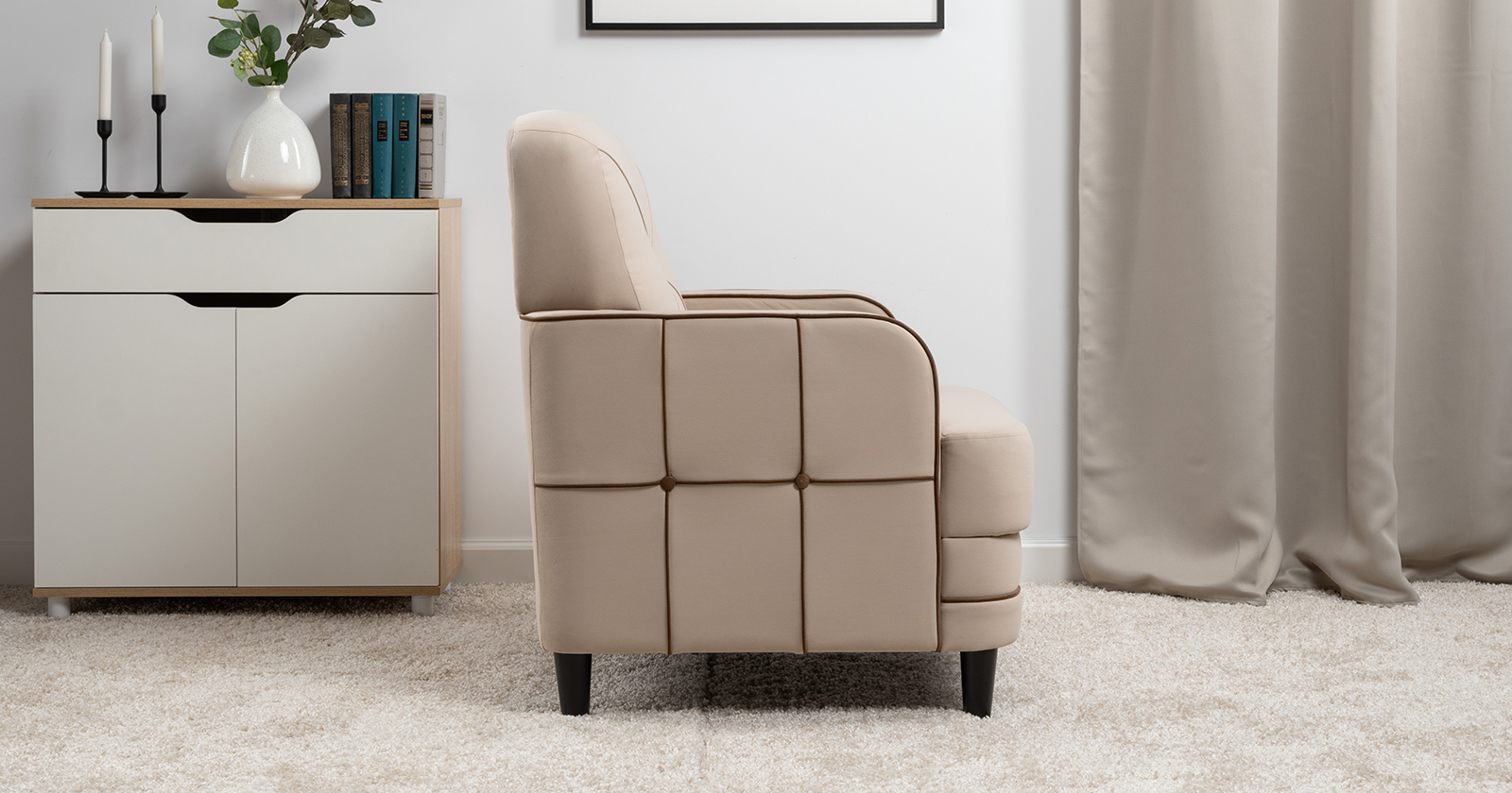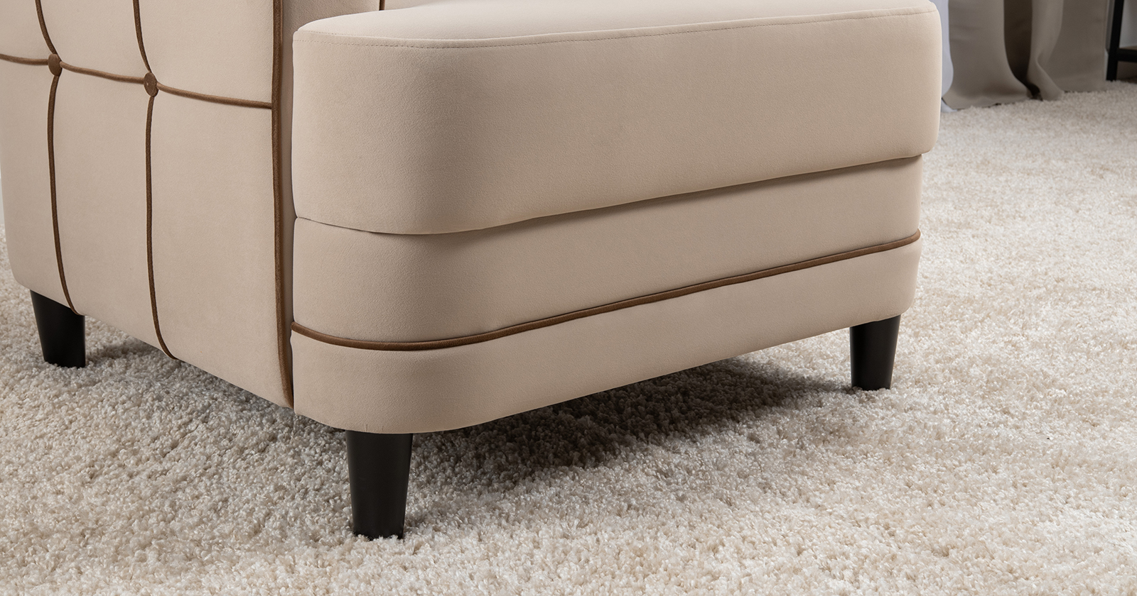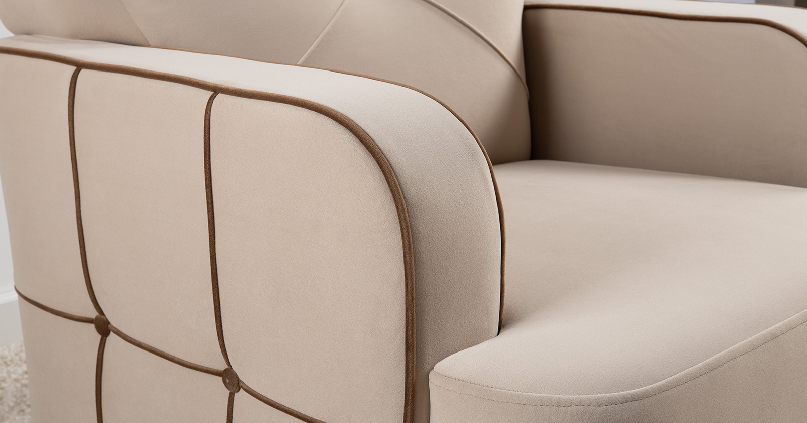 Декоративные канты на вставке подлокотников. Пуговицы в местах пересечения кантов на подушке и вставке подлокотников. По торцам подлокотников и думках контрастный декоративный кант. Защипы на сиденье и подушке.