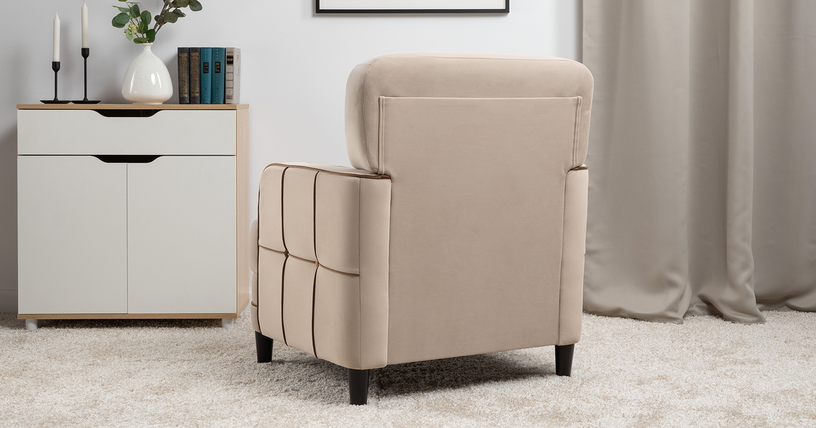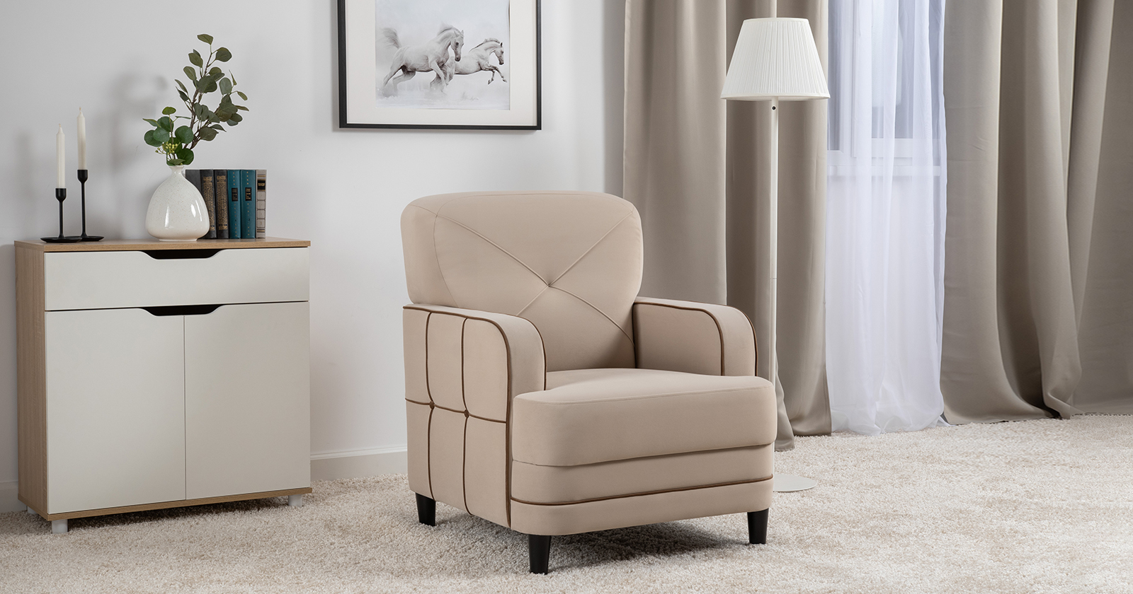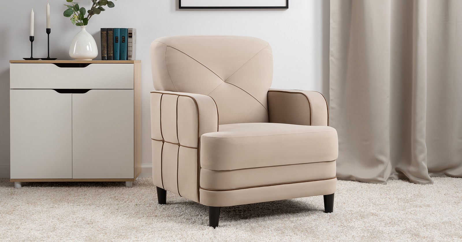 Декоративные канты на вставке подлокотников. Пуговицы в местах пересечения кантов на подушке и вставке подлокотников. По торцам подлокотников и думках контрастный декоративный кант. Защипы на сиденье и подушке.