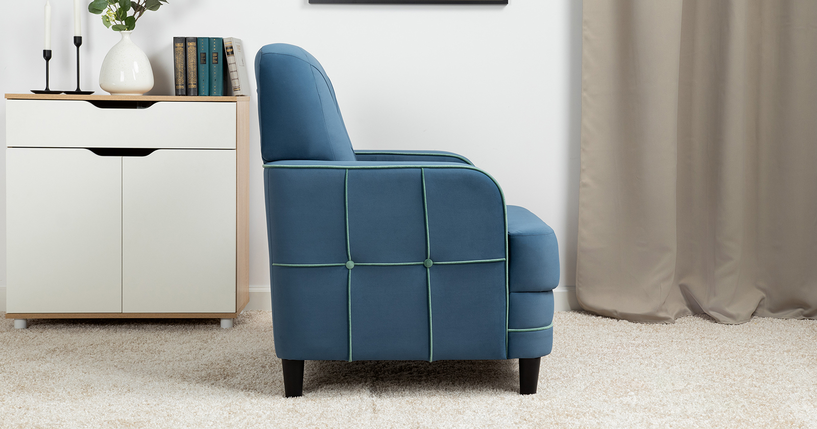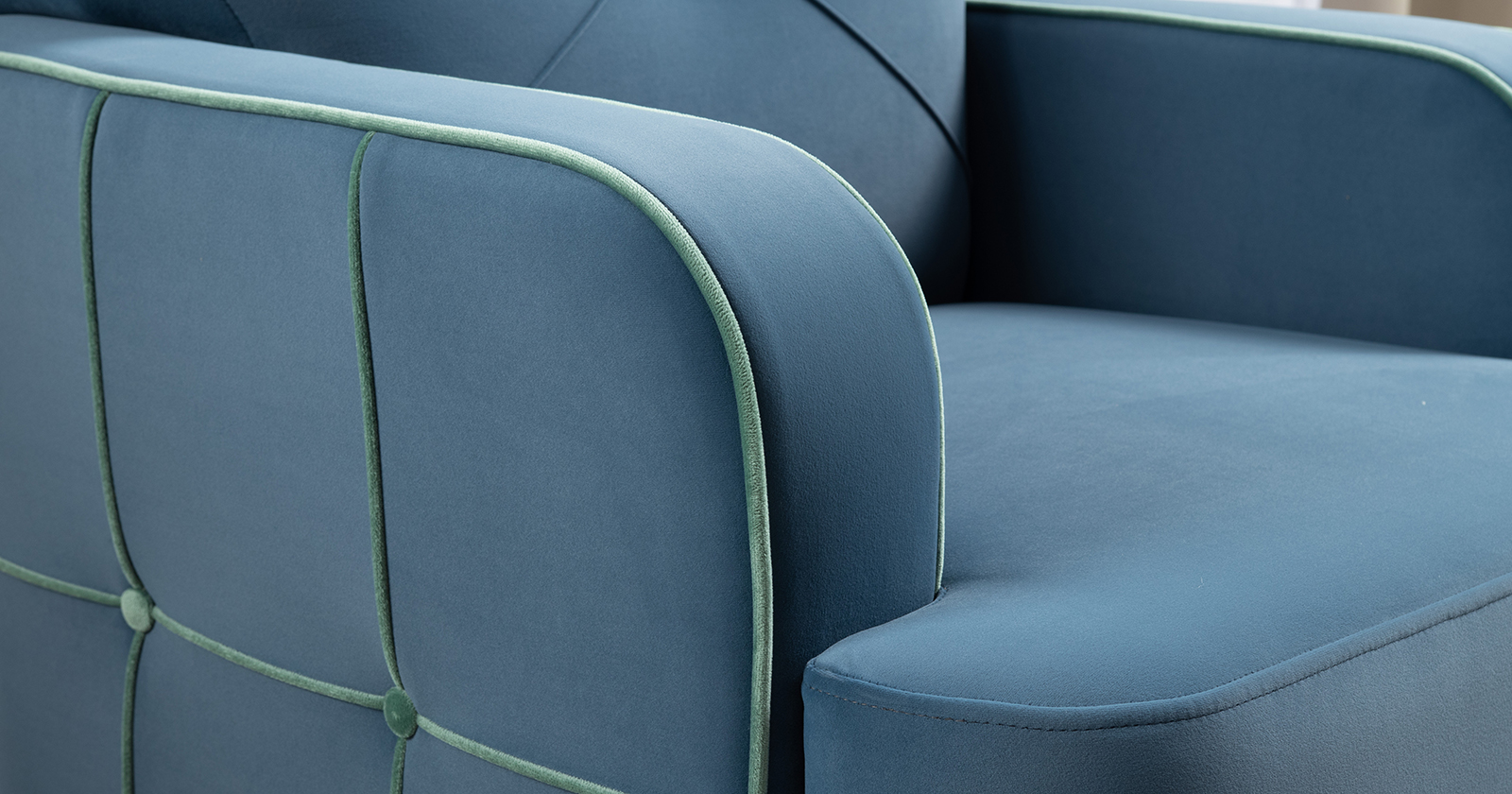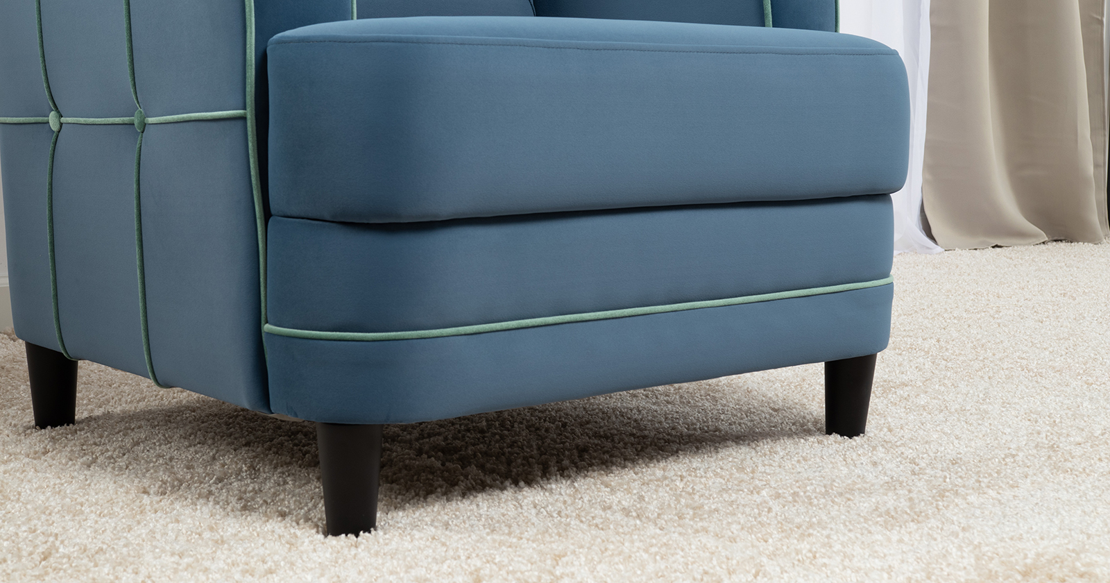 Декоративные канты на вставке подлокотников. Пуговицы в местах пересечения кантов на подушке и вставке подлокотников. По торцам подлокотников и думках контрастный декоративный кант. Защипы на сиденье и подушке.