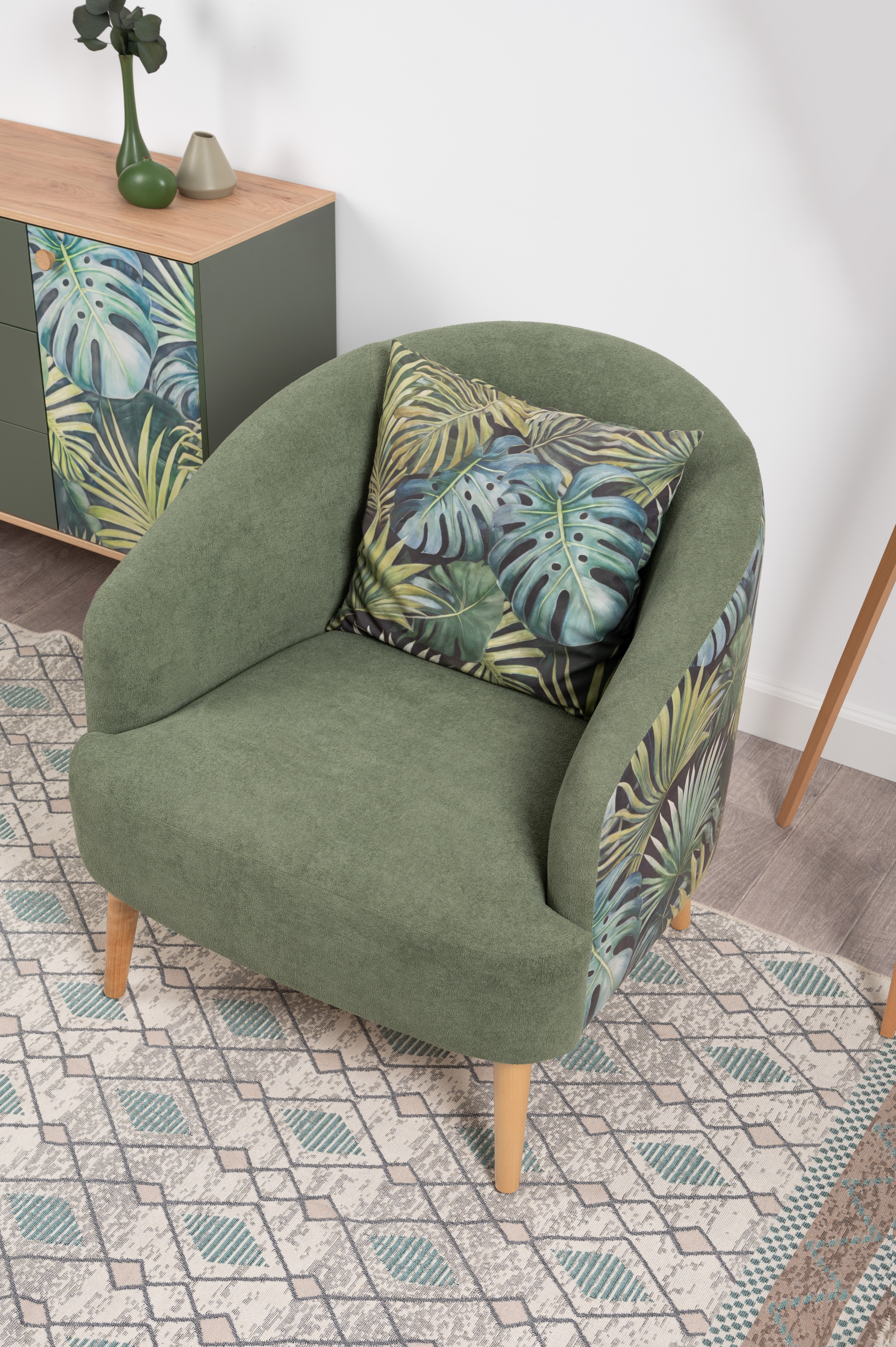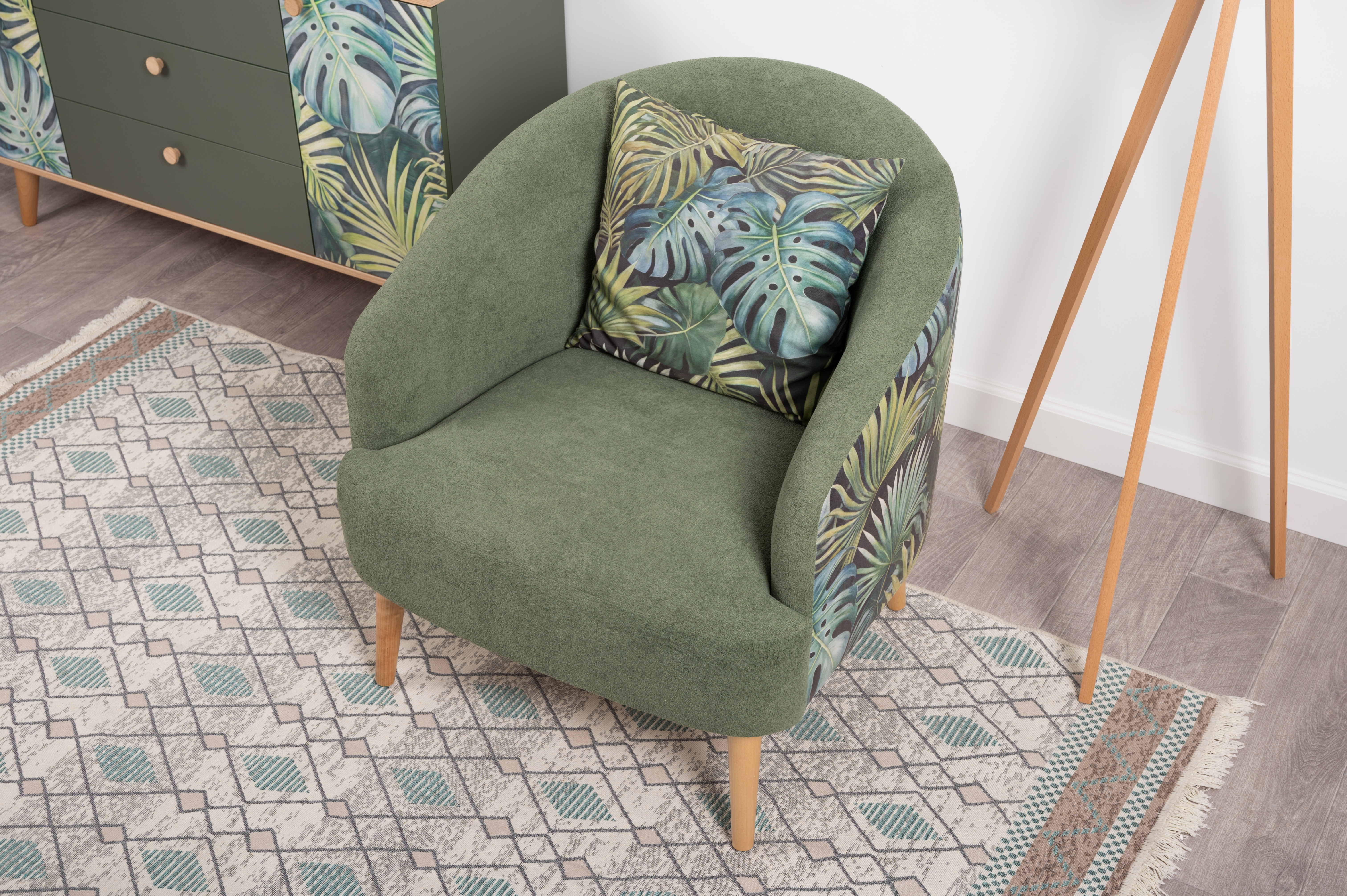 Маттиас — оригинальное кресло готовое стать акцентом в интерьере. Яркий тропический принт «монстера» на спинке мгновенно сделает комнату живой и современной.