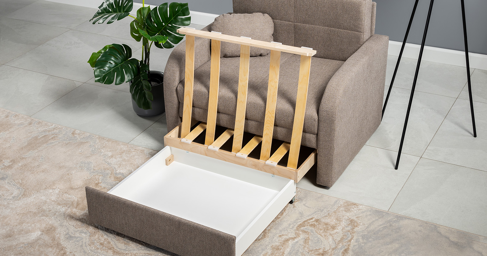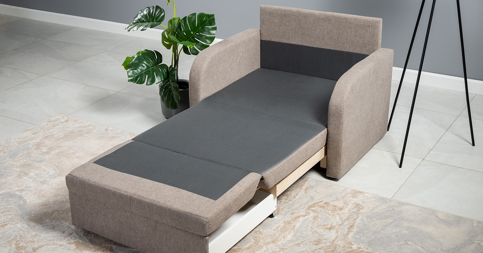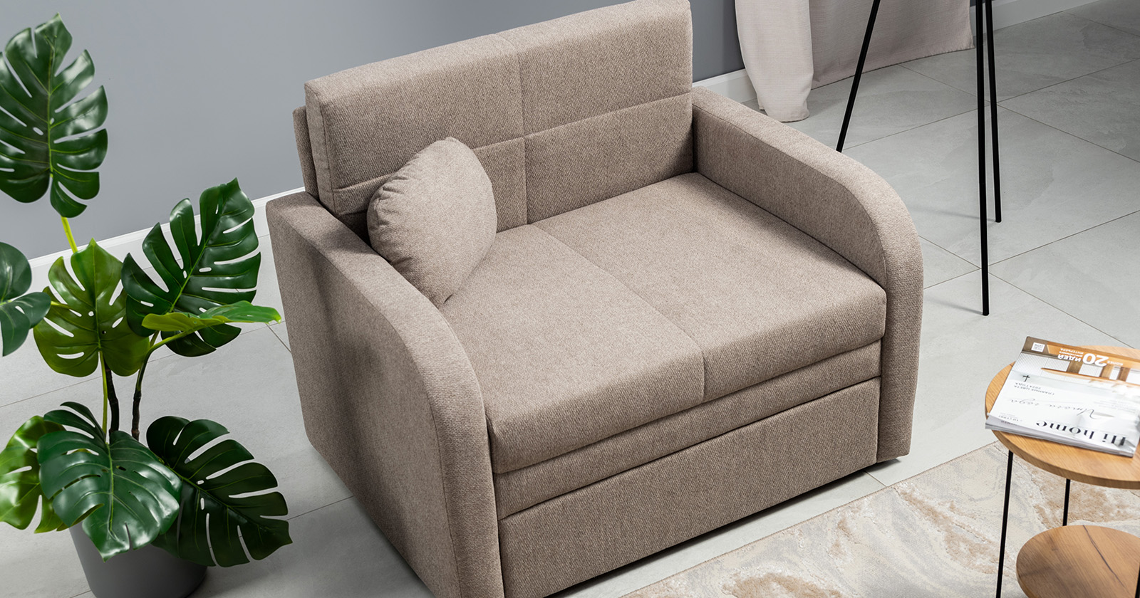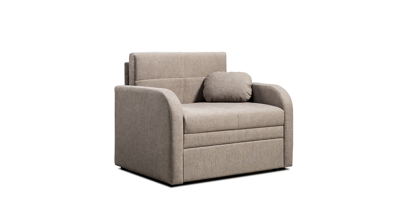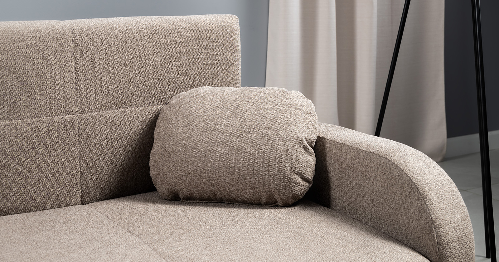 Коллекция выполнена в современном минималистичном стиле с мягкой обивкой из износостойкой ткани и декоративной стежкой, подчеркивающей геометрию форм. Механизм трансформации обеспечивает дополнительное спальное место, делая мебель не только эстетичной, но и максимально функциональной для небольших пространств.