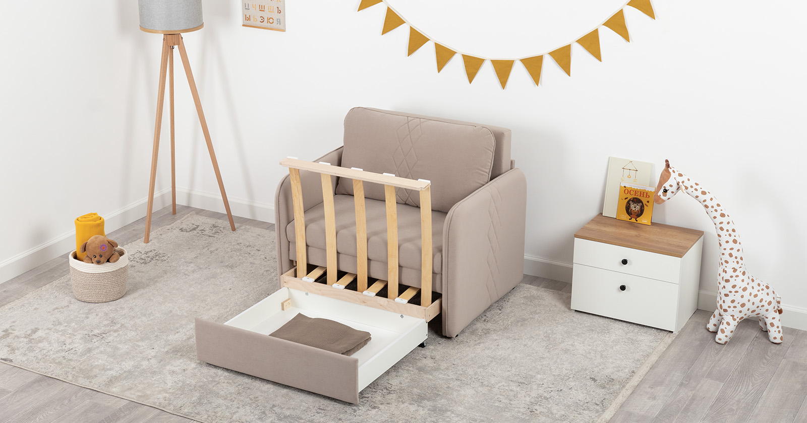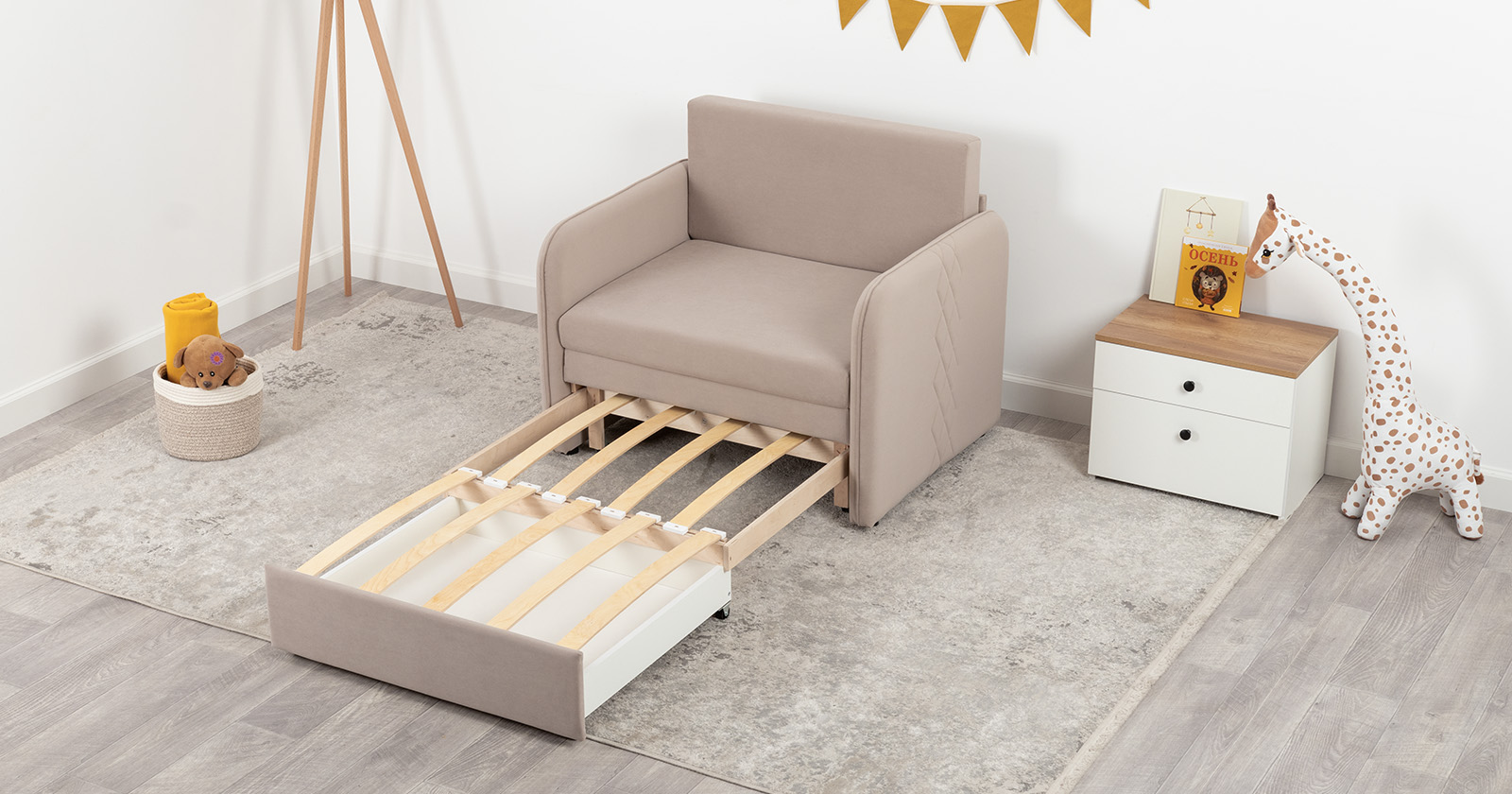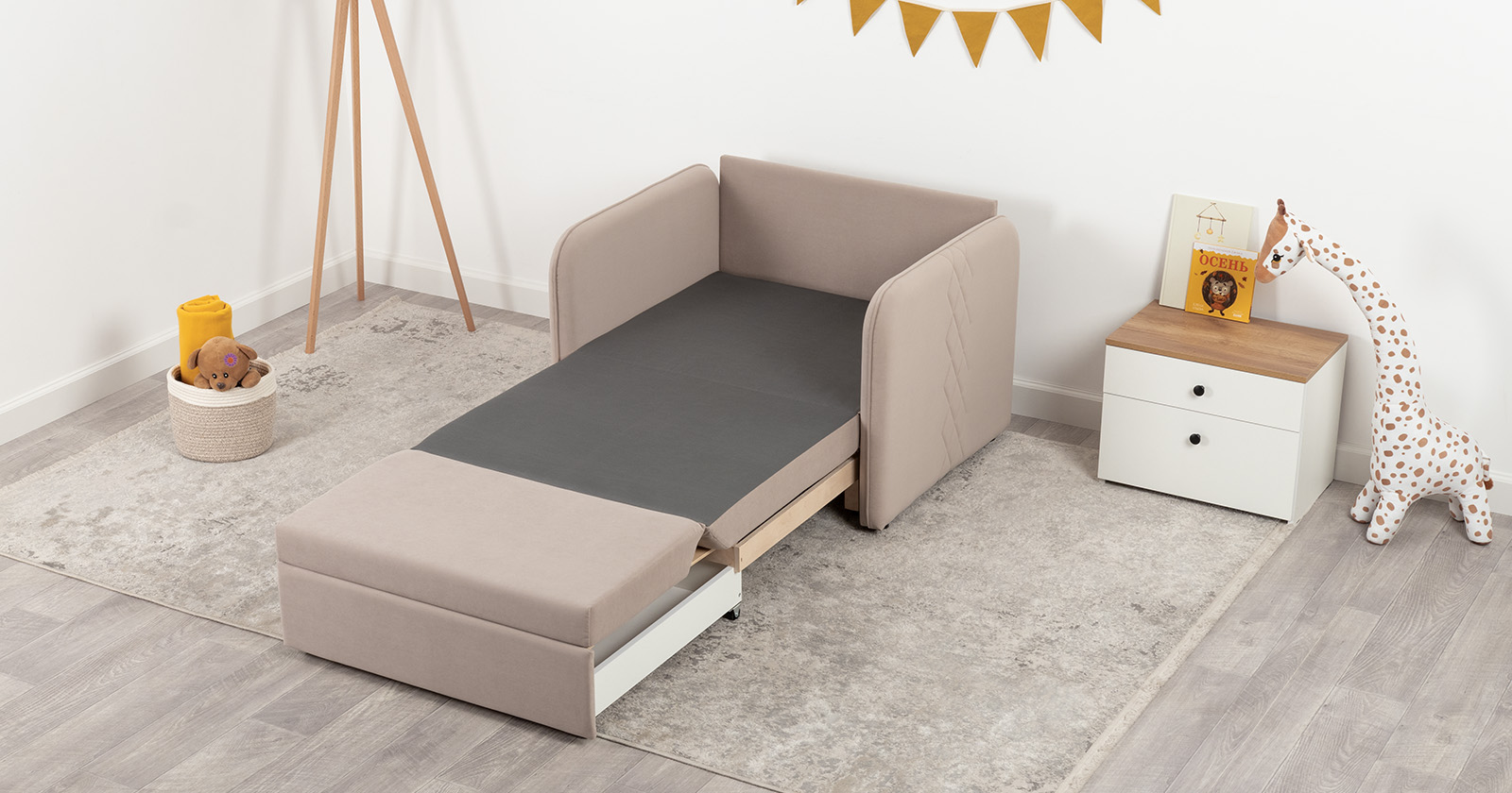 Стильный компактный диван для детской и гостиной. При своих скромных размерах он трансформируется в полноценное спальное место для детей и подростков. Лаконичный дизайн в виде декоративной стежки подчеркивает фактуру велюра, а небольшие размеры позволят разместить его в любом пространстве.