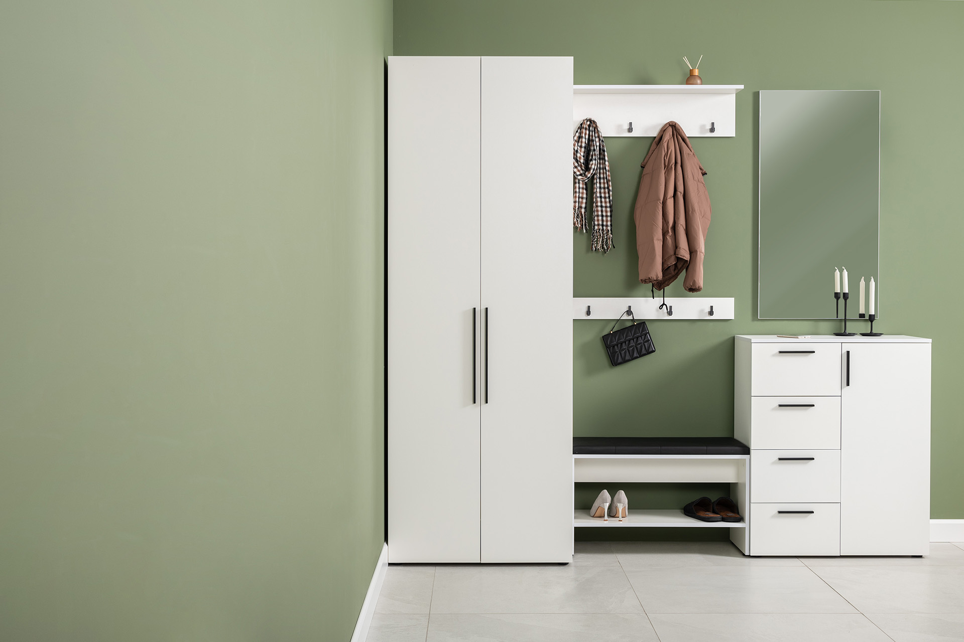 Нейтральный белый цвет визуально расширит ограниченное пространство прихожей.