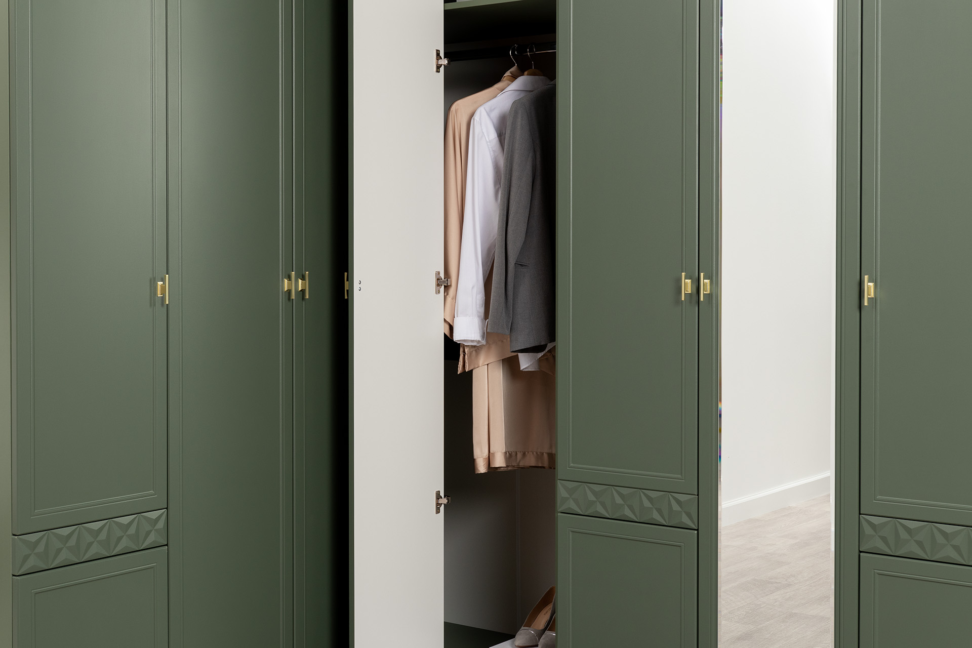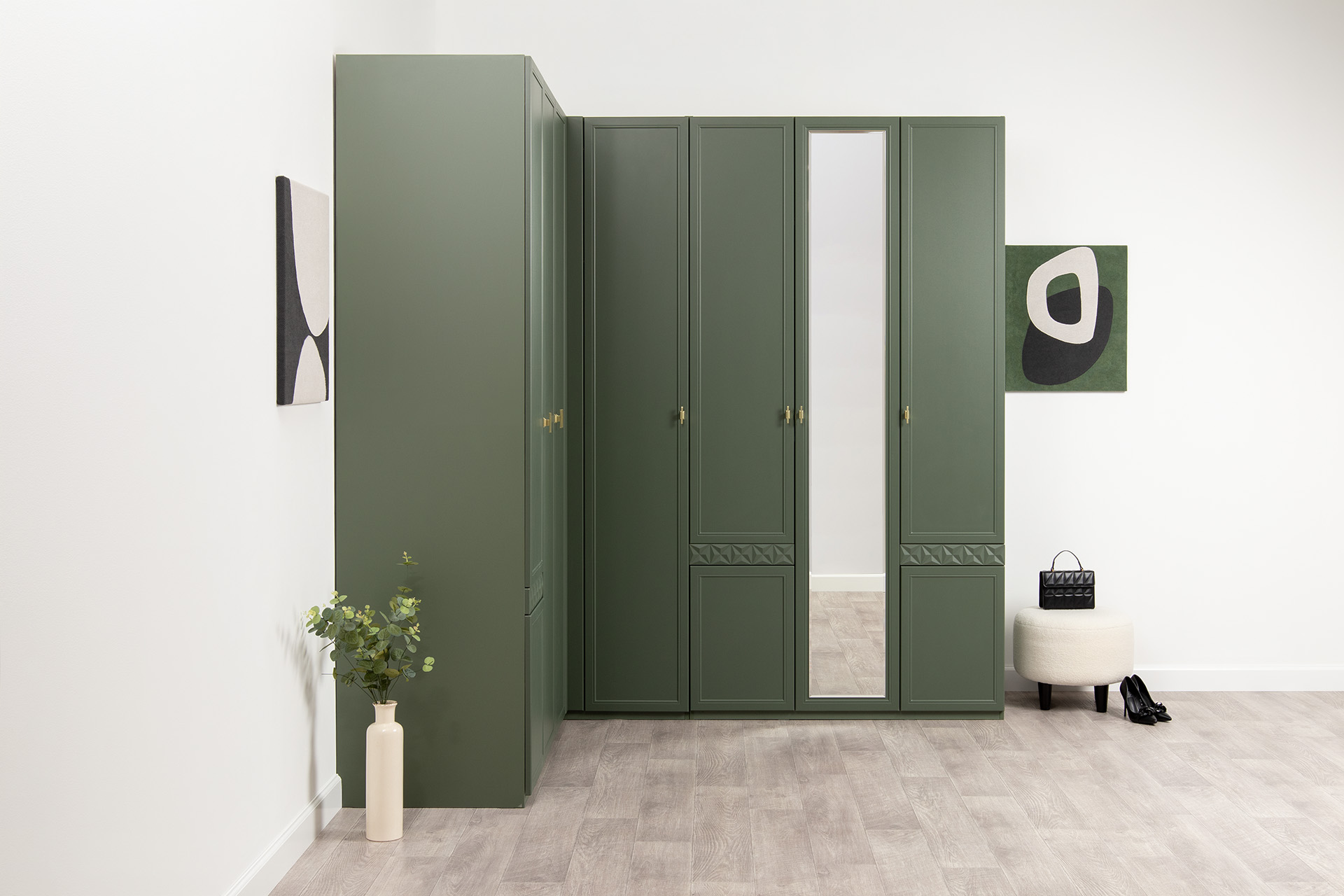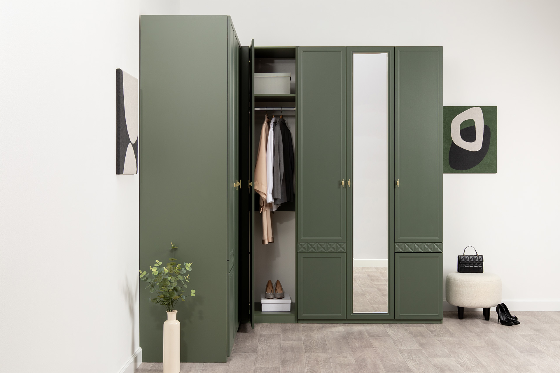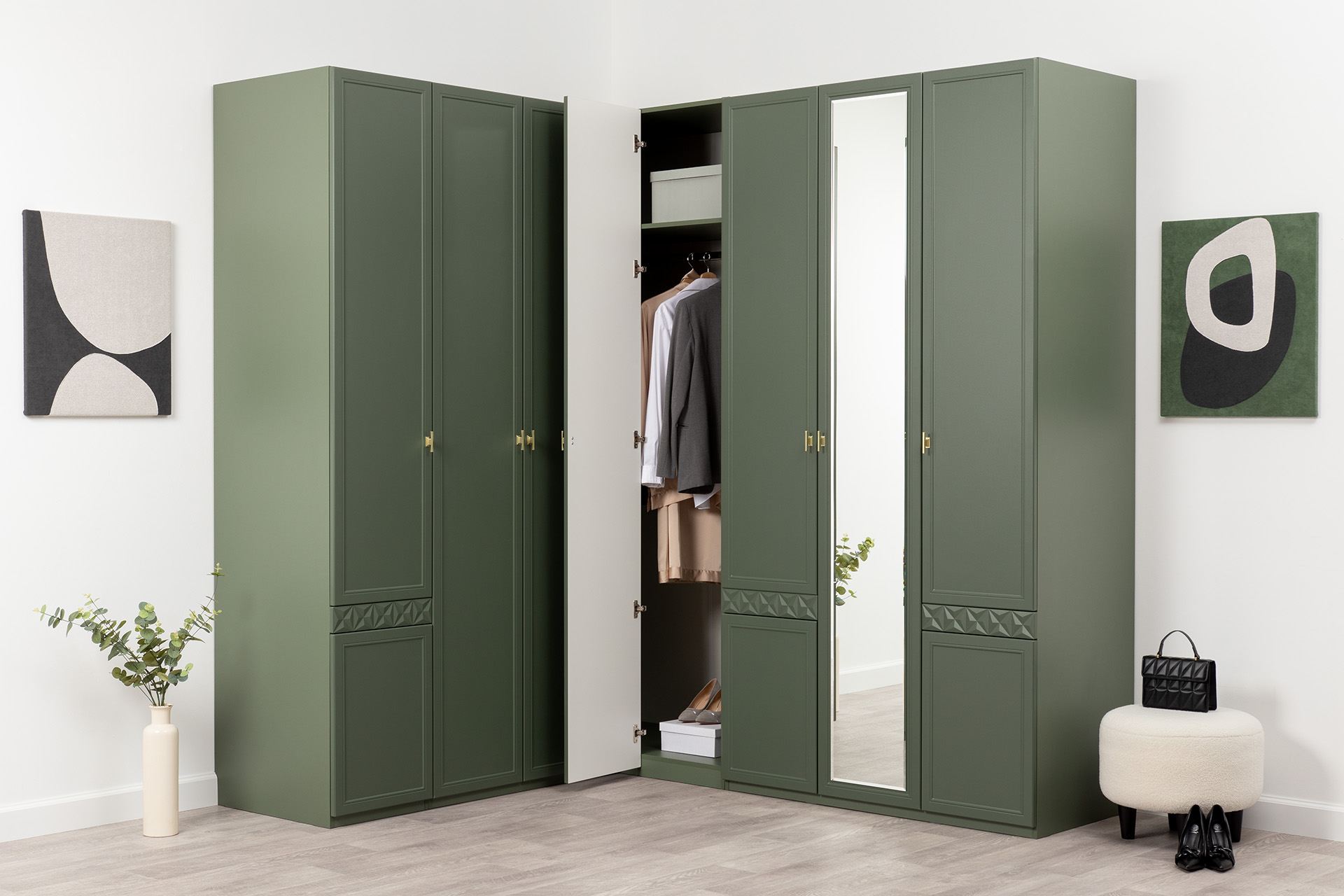 Шкаф угловой Марион 16.339 дымчатый зеленый K521, олива шагрень AG 1050 ПВХ (собирается на любую сторону)