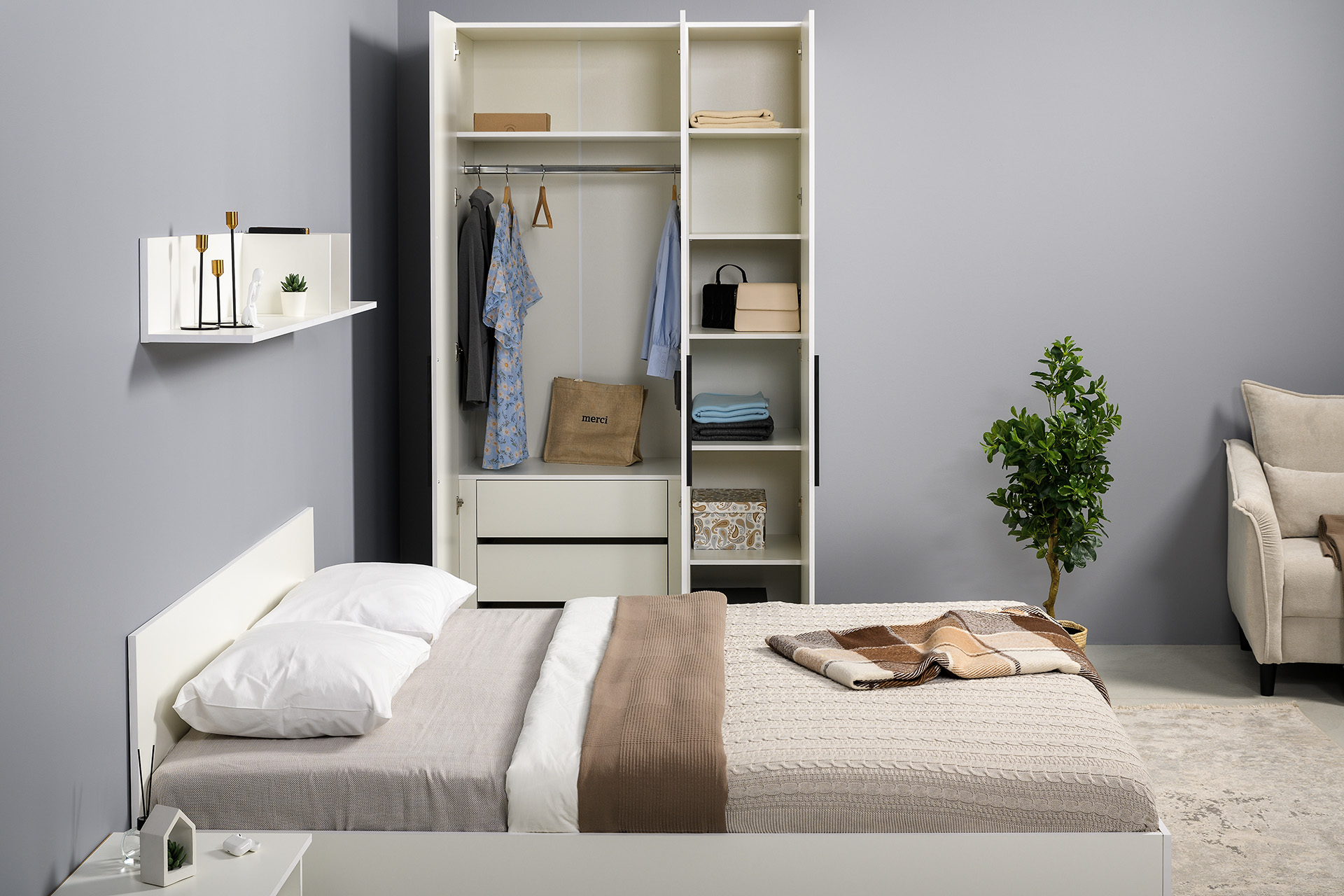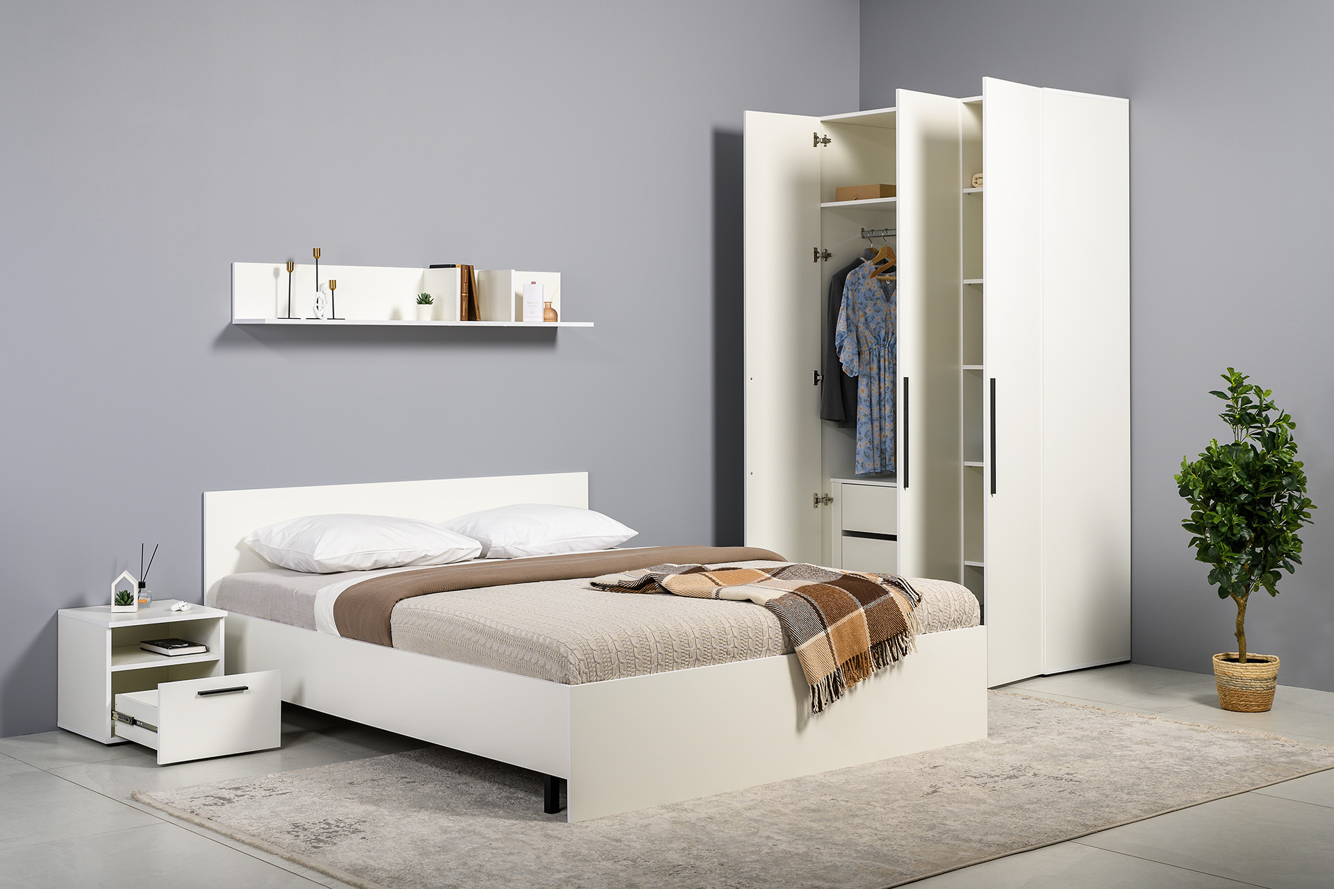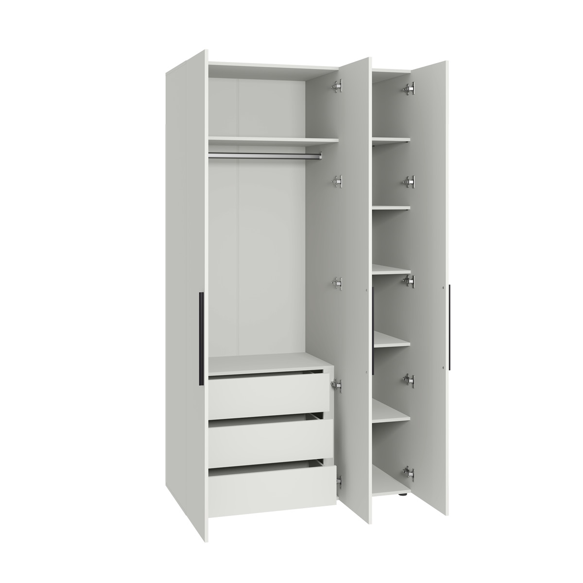 Два варианта кровати: ширина спального места 1200 и 1600 мм. Вместительный трёхстворчатый шкаф полноценной глубины с выдвижными ящиками и съемными полками. Ящики оснащены направляющими полного выдвижения.
