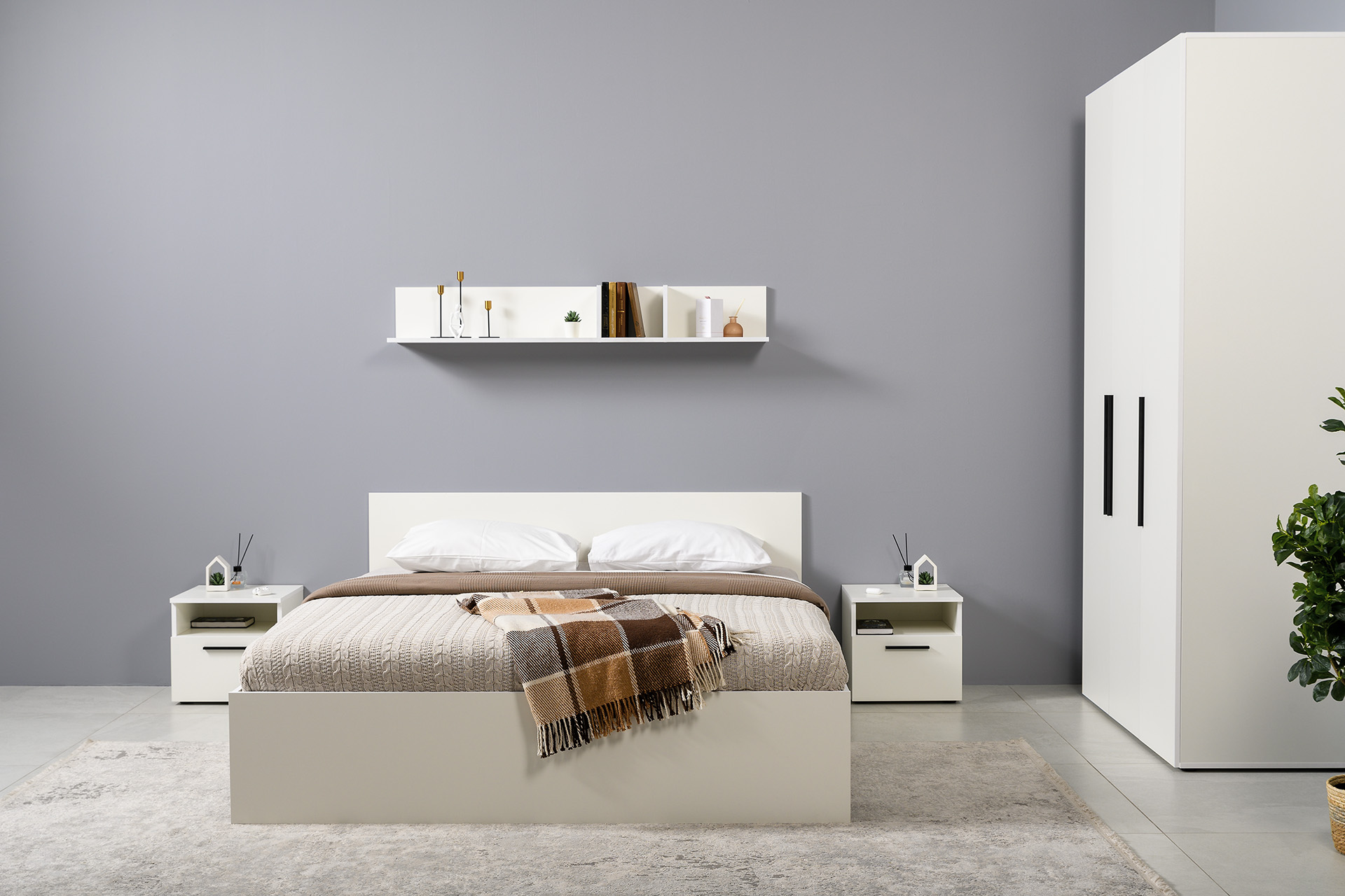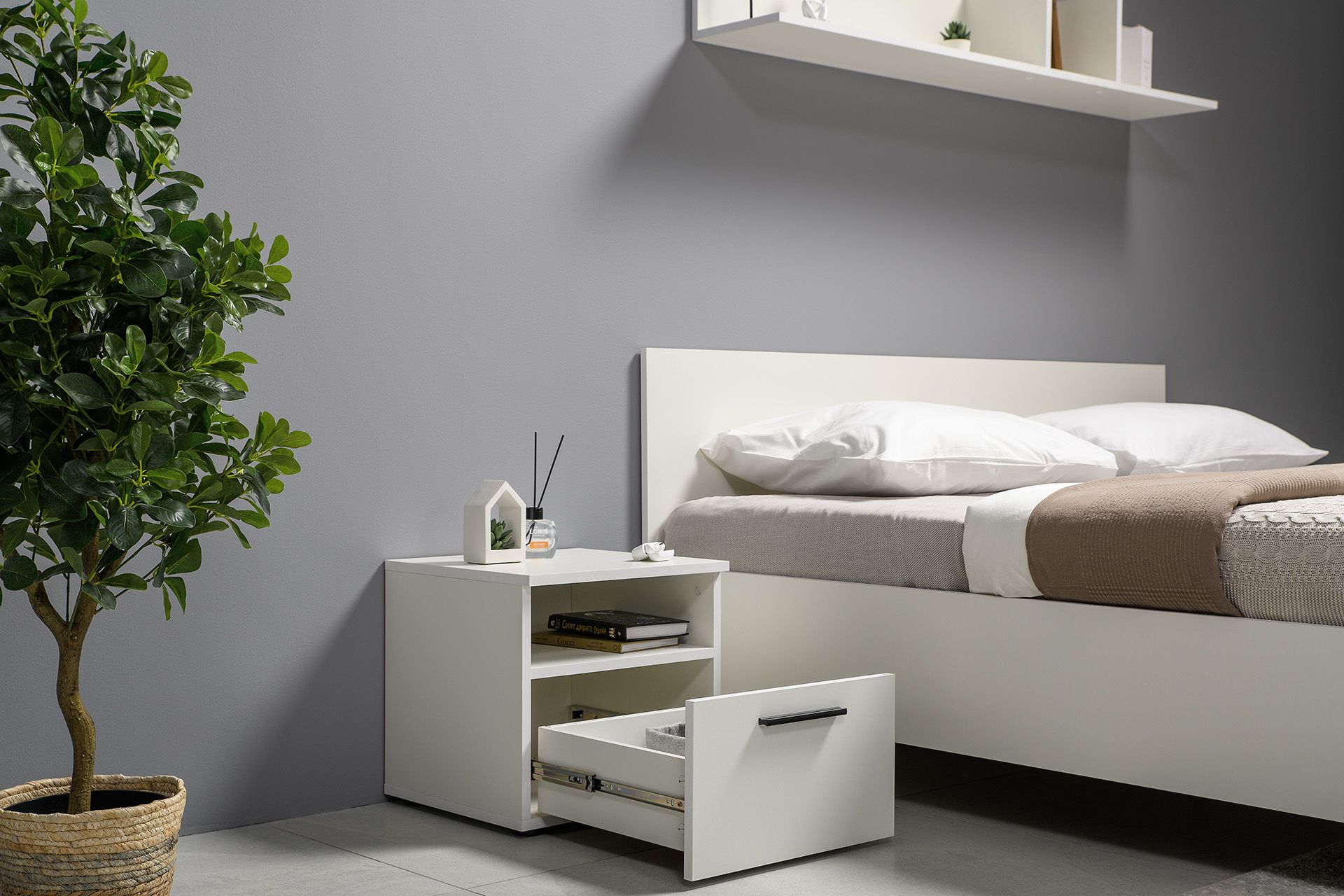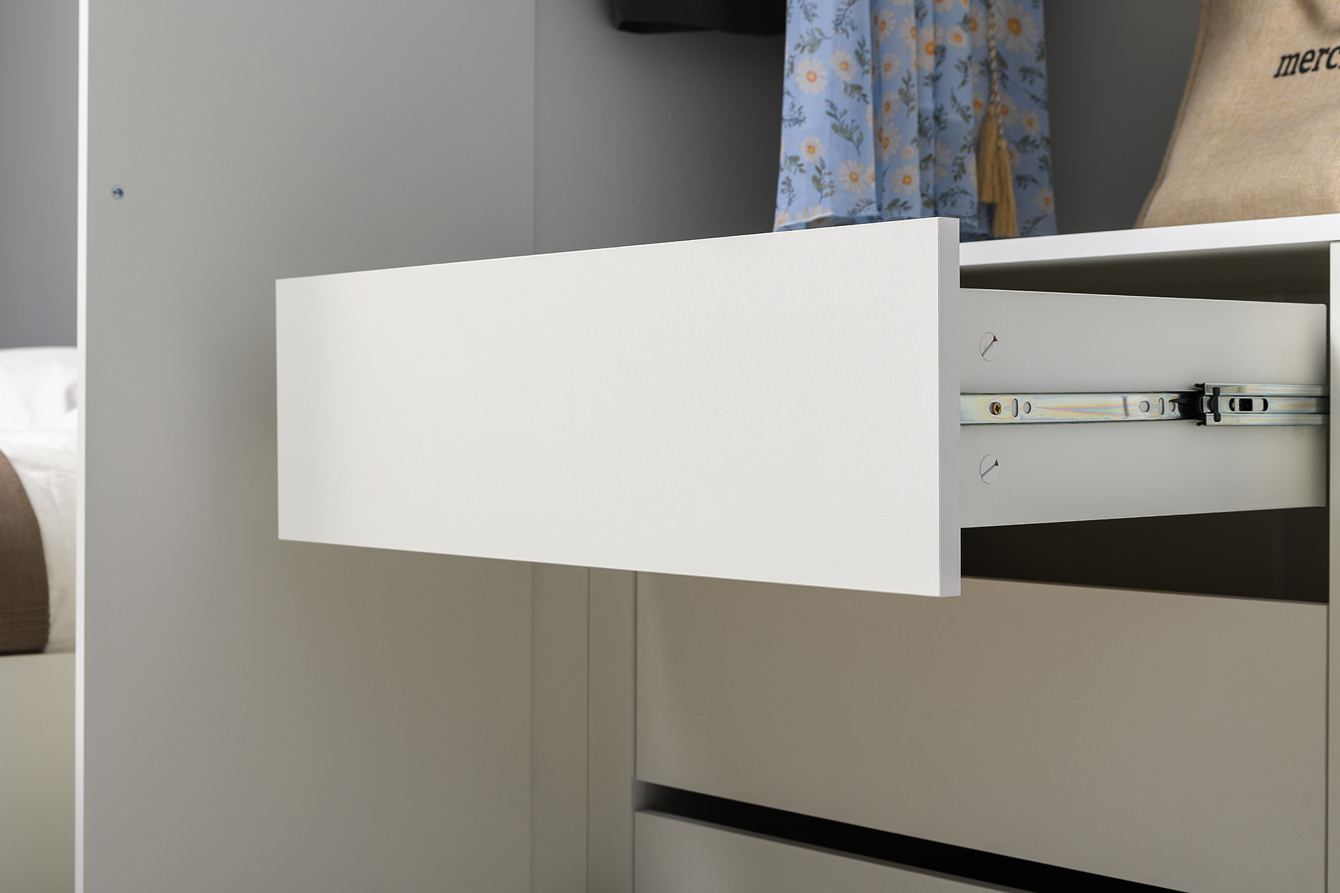 Два варианта кровати: ширина спального места 1200 и 1600 мм. Вместительный трёхстворчатый шкаф полноценной глубины с выдвижными ящиками и съемными полками. Ящики оснащены направляющими полного выдвижения.