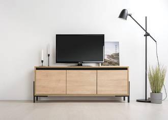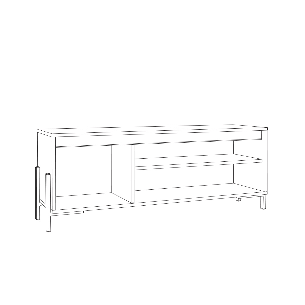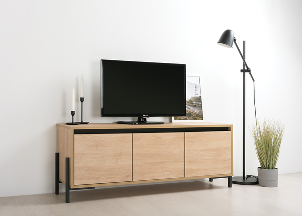 Минималистичный современный дизайн тумбы дополняют металлические опоры в стиле лофт. Анодированный алюминиевый профиль служит конструктивным и декоративным элементом, надежной фурнитурой при эксплуатации. Новый декор ЛДСП наделен естественным тиснением и максимально приближен к натуральной древесине. Корпус выполнен из плиты с увеличенной толщиной ЛДСП 18 мм с кромкой 1 мм. Такой материал готов к повышенным нагрузкам, а толстая кромка делает тумбу более устойчивой перед негативными факторами внешней среды. В столешнице имеется вырез под провода для подключения мультимедиа техники.