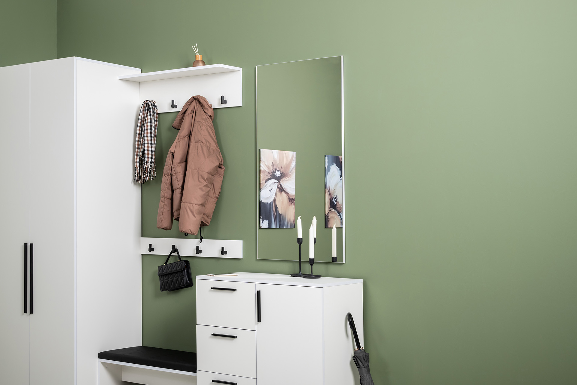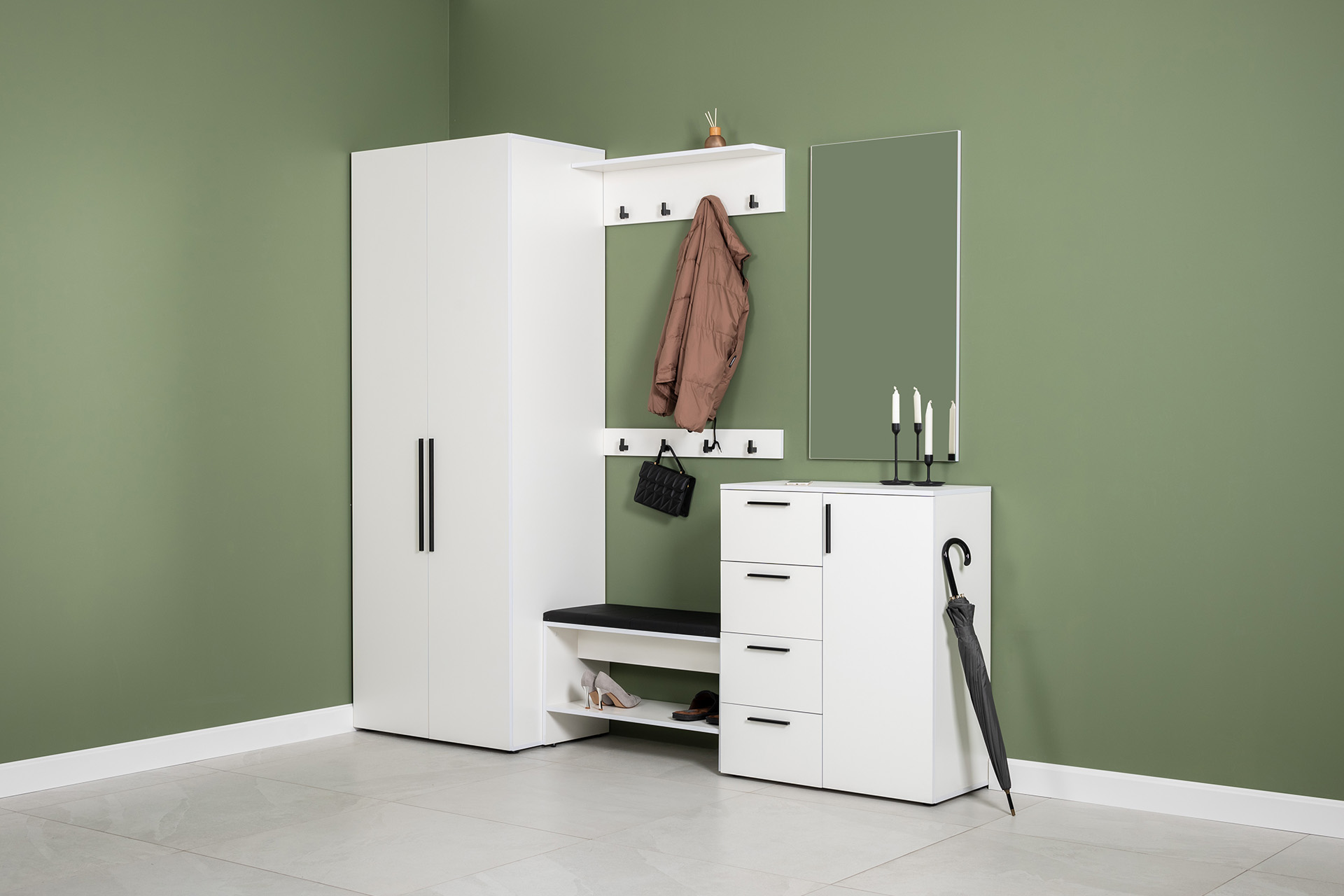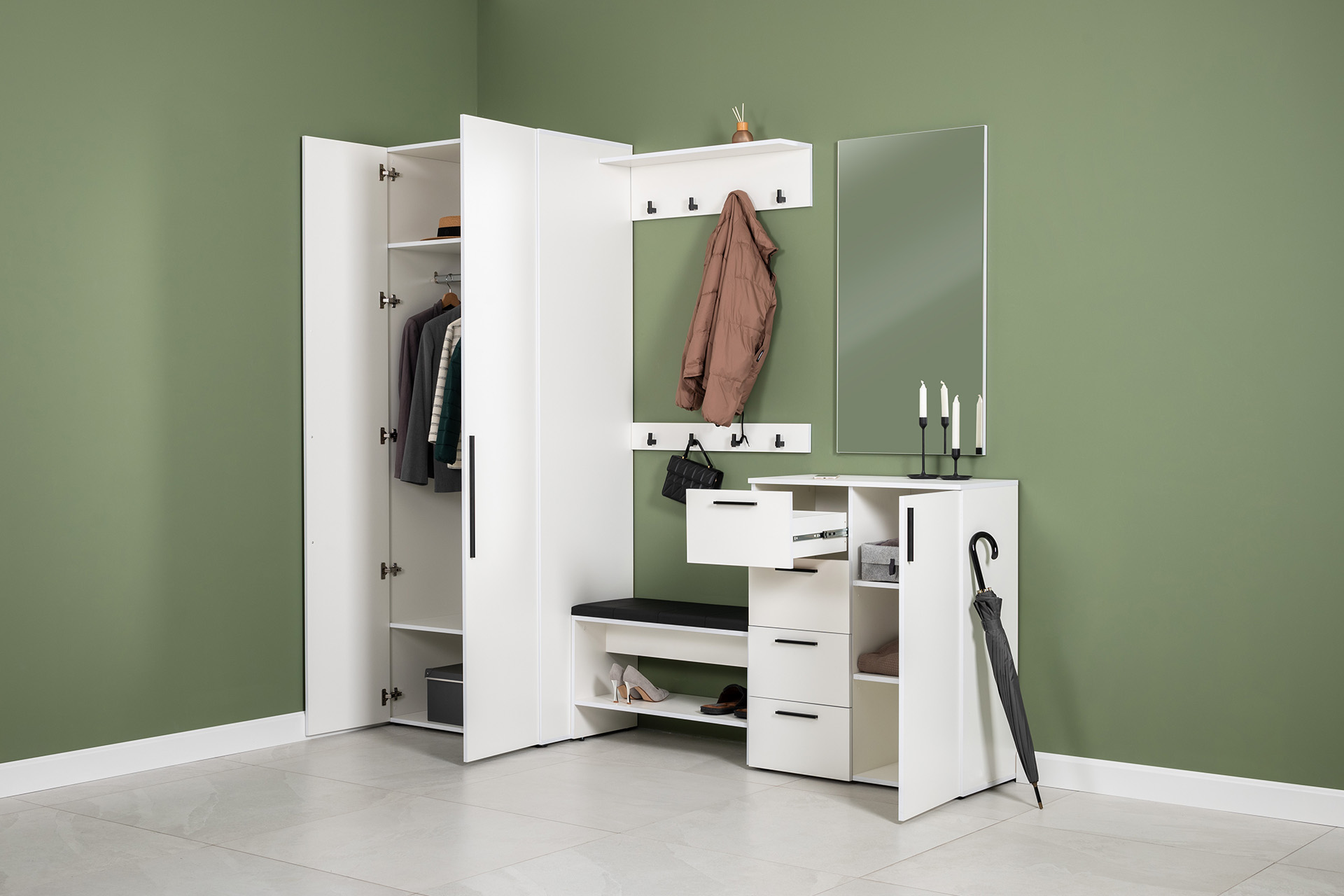 Вместительный шкаф полноразмерной глубины можно дополнить тумбой для обуви с мягким сиденьем и нишами для хранения, зеркалом и минималистичными вешалками.